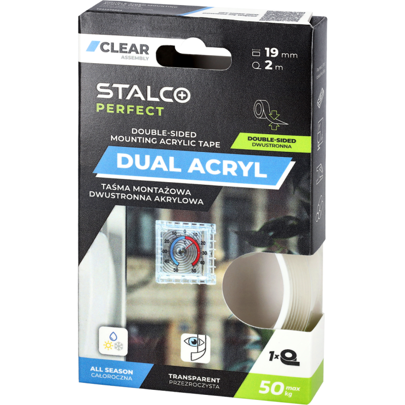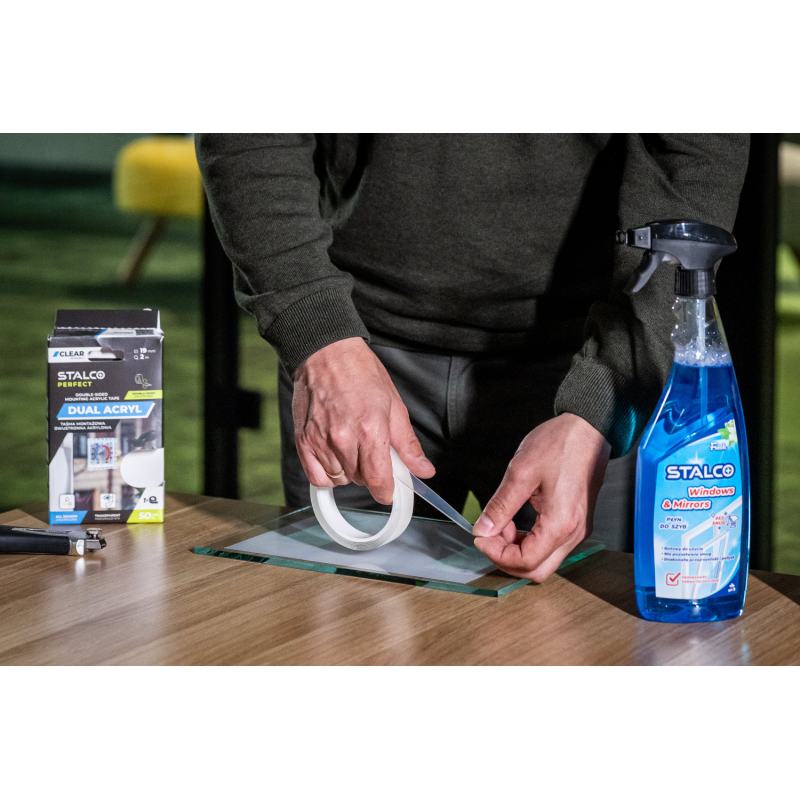 Priehľadná obojstranná akrylová páska STALCO PERFECT (19 mm x 2 m). Alternatíva k nitovaniu a zváraniu. Spája kov, drevo, sklo a plasty. UV odolná, pre interiér aj exteriér.