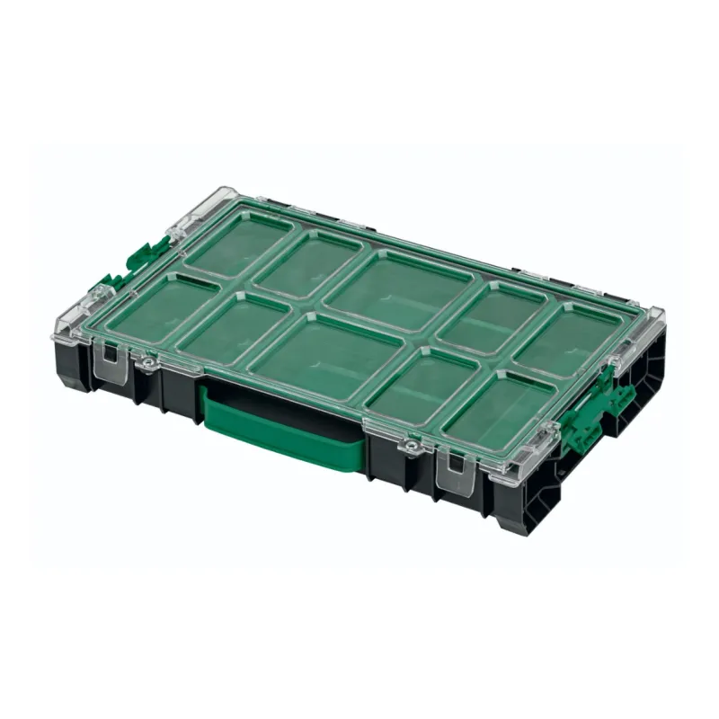 Nízky organizér (výška 79 mm) s priehľadným polykarbonátovým vekom. Tesnenie proti vode a prachu, polyamidové zámky. Obsahuje 4 modely vaničiek.