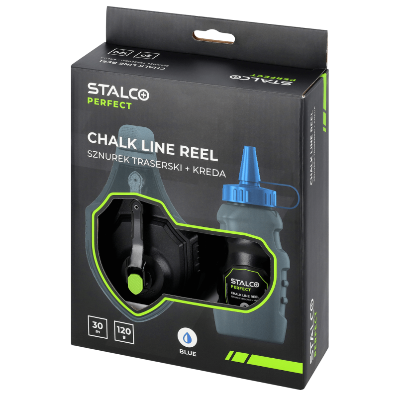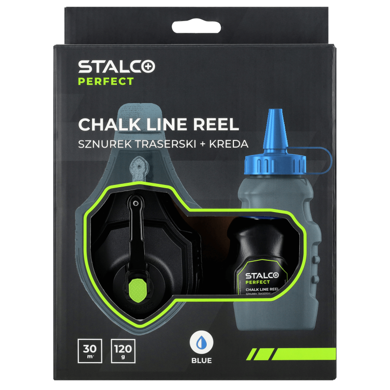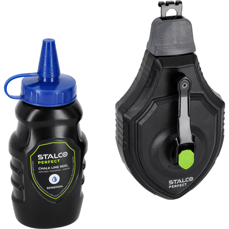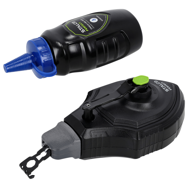Profesionálna značkovacia šnúra STALCO PERFECT s hliníkovým telesom a 120 g kriedy – určená na presné značenie čiar pri náročných stavebných prácach.