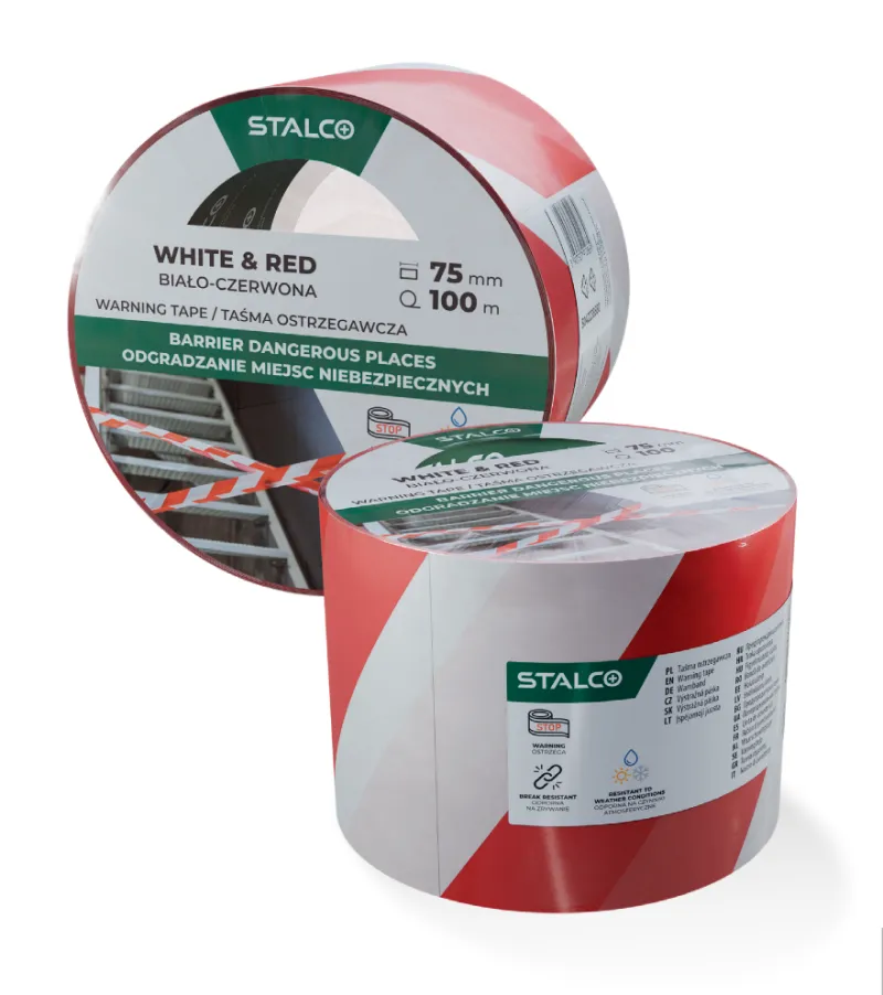 Výstražná bielo-červená páska STALCO je trvácna a viditeľná páska určená na vytyčovanie nebezpečných zón, zakázaných oblastí a miest vyžadujúcich osobitné označenie. Používa sa v miestach, kde je zakázaný vstup alebo prechod, napr. pri výkopoch, stavebných prácach, čerstvo natretých prvkoch alebo pri prekážkach. Upevňuje sa priviazaním o stabilné prvky. Páska nie je pokrytá lepidlom.