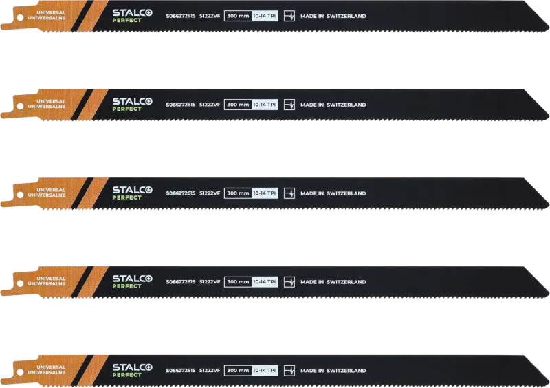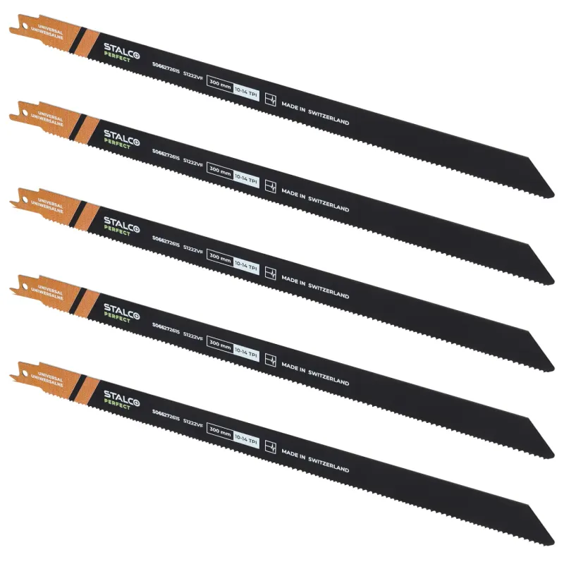 5-dielna súprava flexibilných bimetalových listov (BIM) S1222VF pre chvostové píly. Dĺžka 300 mm. Univerzálne použitie (drevo s klincami, palety, kovy). Variabilné ozubenie (10-14 TPI).