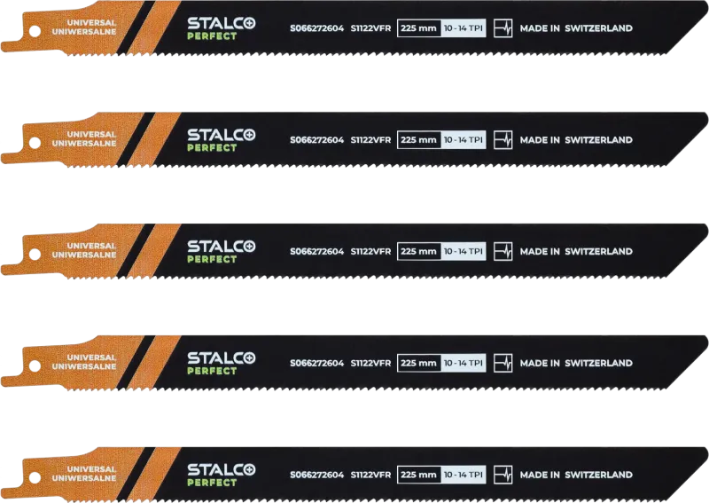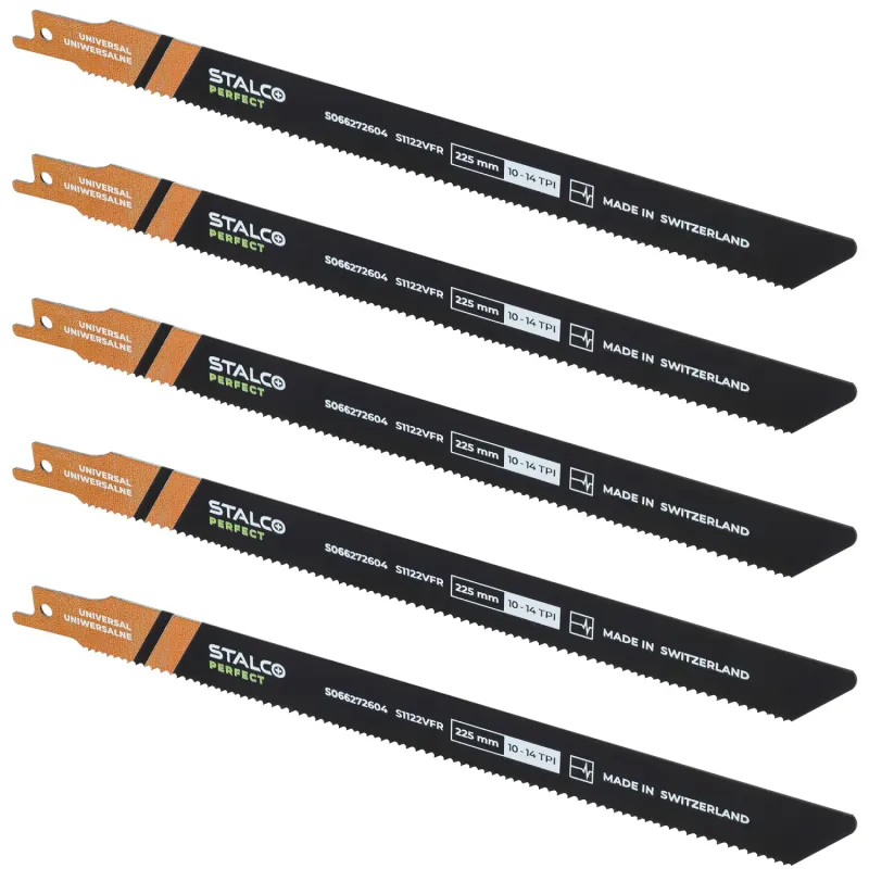 5-dielna súprava bimetalových listov S1122VFR špeciálne na opravu paliet. Dĺžka 225 mm. Obrátený hrot "Reverse tip" proti zasekávaniu. Variabilné ozubenie 10-14 TPI.