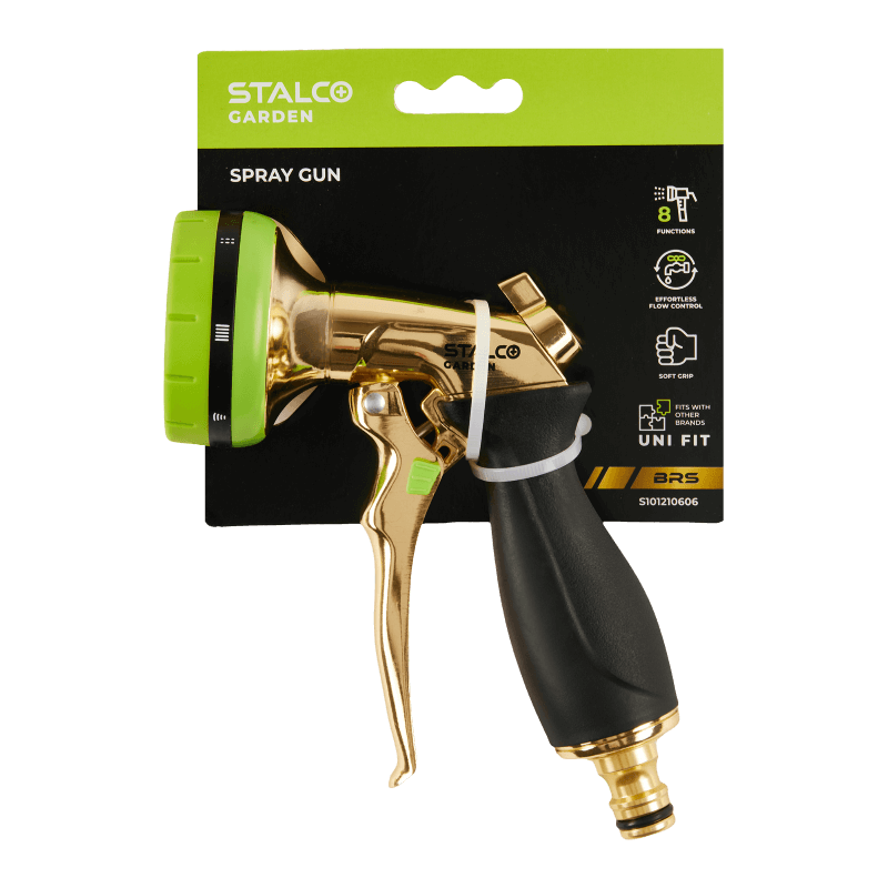8-funkčná mosadzná postrekovacia pištoľ STALCO GARDEN BRS s mäkkou rukoväťou a reguláciou prietoku. Vhodná na zavlažovanie a umývanie, kompatibilná s príslušenstvom iných značiek vďaka systému UNI FIT.