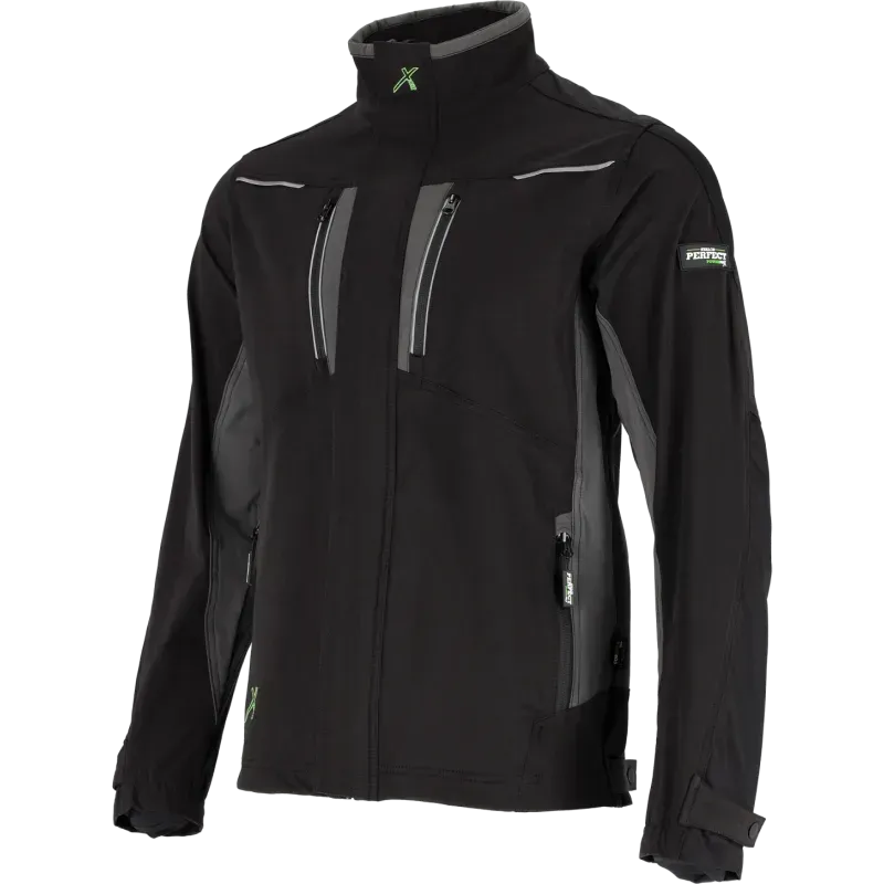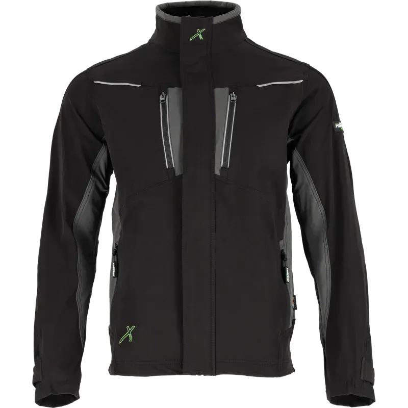 Pracovná bunda STRETCH LINE v čiernej farbe. Vyrobená z elastického materiálu s vlastnosťami softshellu pre dynamickú prácu. Ponúka vetranie v podpazuší, 4 vrecká na zips a reflexné prvky 3M.