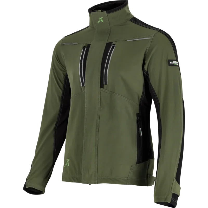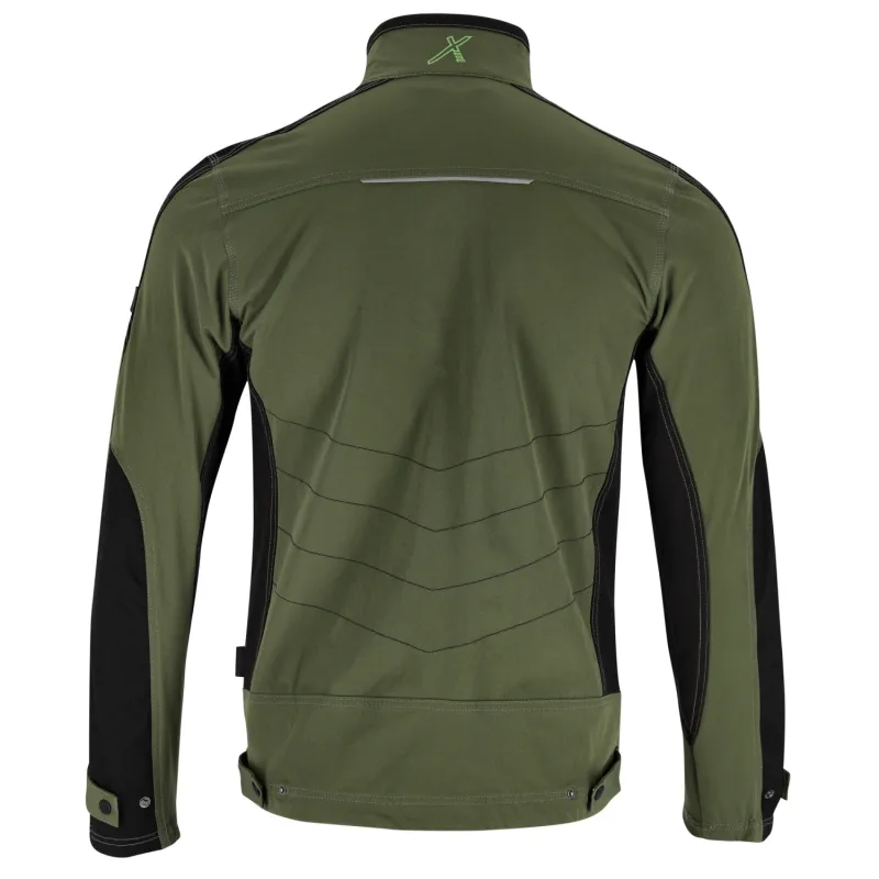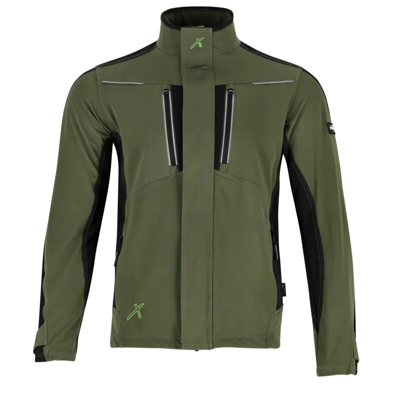 Pracovná bunda STRETCH LINE v olivovo zelenej farbe. Vyrobená z elastického materiálu s vlastnosťami softshellu pre dynamickú prácu. Ponúka vetranie v podpazuší, 4 vrecká na zips a reflexné prvky 3M.