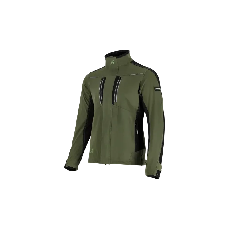 Pracovná bunda STRETCH LINE v olivovo zelenej farbe. Vyrobená z elastického materiálu s vlastnosťami softshellu pre dynamickú prácu. Ponúka vetranie v podpazuší, 4 vrecká na zips a reflexné prvky 3M.