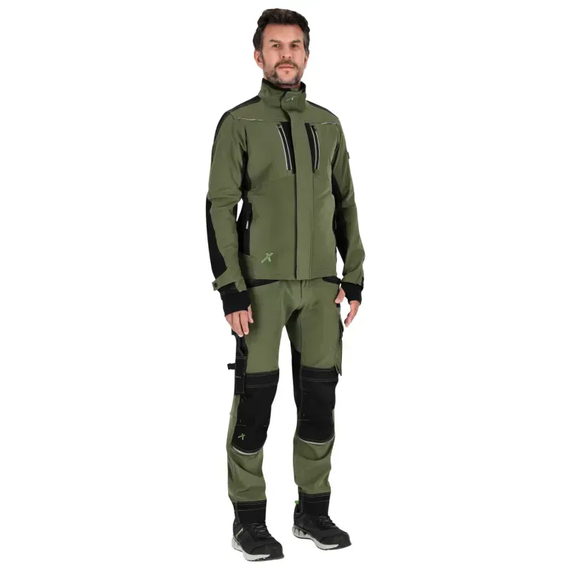Pracovná bunda STRETCH LINE v olivovo zelenej farbe. Vyrobená z elastického materiálu s vlastnosťami softshellu pre dynamickú prácu. Ponúka vetranie v podpazuší, 4 vrecká na zips a reflexné prvky 3M.