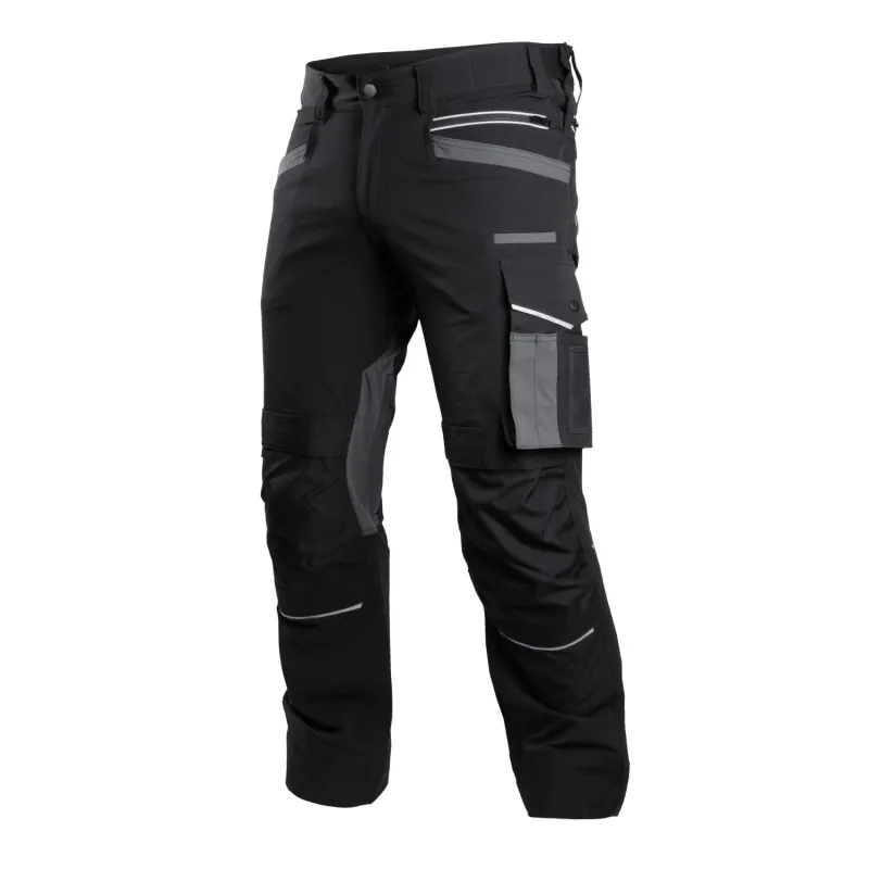 Pracovné nohavice STRETCH LINE v čiernej farbe. Vyrobené z elastického materiálu pre dynamickú prácu. Ponúkajú vetranie na zips, zosilnenie CORDURA na kolenách a vreckách, a možnosť predĺženia nohavíc o 4 cm.