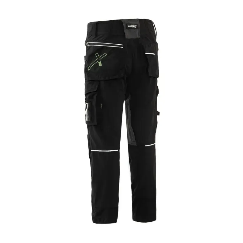Pracovné nohavice STRETCH LINE v čiernej farbe. Vyrobené z elastického materiálu pre dynamickú prácu. Ponúkajú vetranie na zips, zosilnenie CORDURA na kolenách a vreckách, a možnosť predĺženia nohavíc o 4 cm.