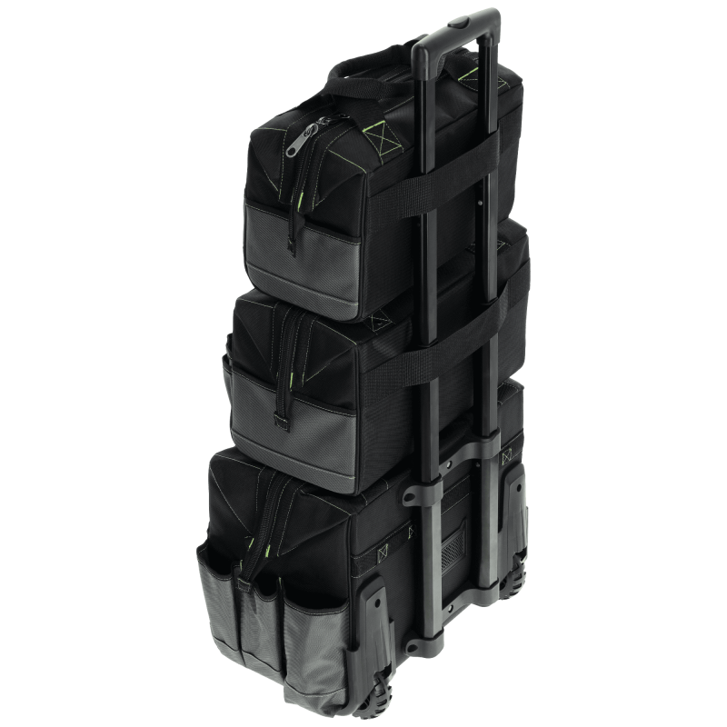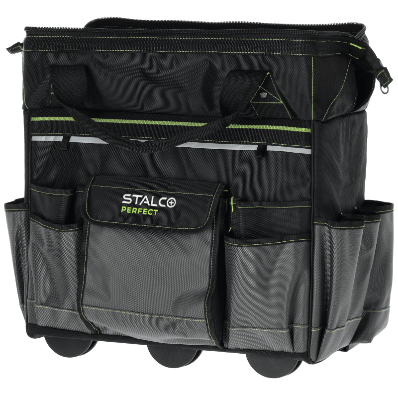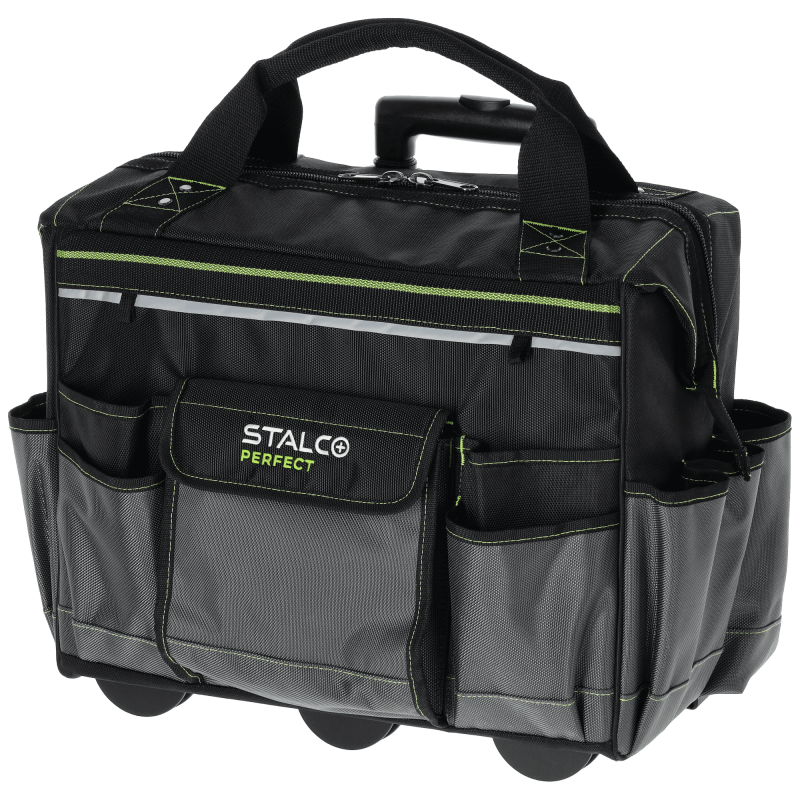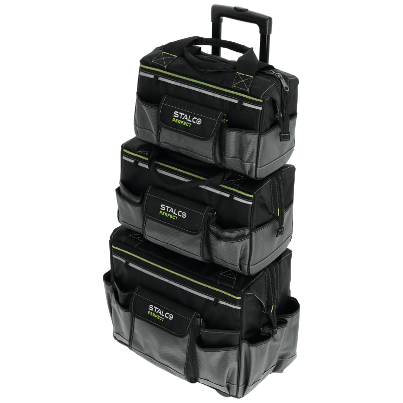 Veľká pojazdná taška STALCO PERFECT TNP10L je navrhnutá na transport ťažkého a objemného náradia bez namáhania chrbta. Je vybavená masívnymi plastovými kolieskami a teleskopickou rukoväťou, pričom môže slúžiť aj ako základňa pre menšie tašky z tejto série (TNP10M, TNP10S). Tuhá konštrukcia z extra odolného polyesteru chráni obsah, kým 11 vonkajších a 6 vnútorných vreciek zabezpečí dokonalý poriadok. Obsahuje reflexné prvky a zosilnené zipsy s dvojitým prešitím.