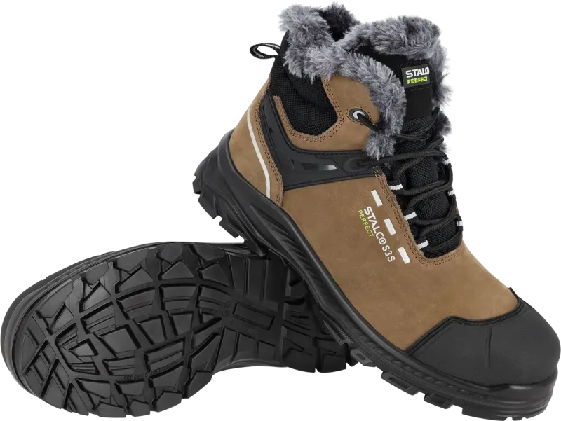 Profesionálna zateplená bezpečnostná obuv STALCO PERFECT (S3S SR FO CI HI), veľ. 44. Zvršok z prémiovej nubukovej kože, vodeodolná membrána, zateplenie umelou kožušinou, kompozitná špica a kevlarová stielka.