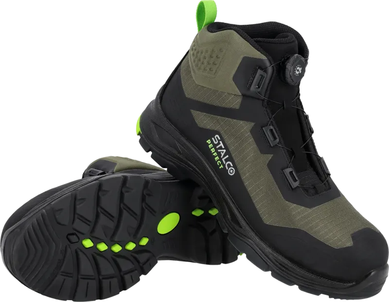 Moderná členková bezpečnostná obuv STALCO PERFECT (S3S SR FO), veľ. 47. Inovatívny systém uťahovania "spinlock" (otočné koliesko). Zvršok z TPU, kompozitná špica, kompozitná stielka a protišmyková PU/Guma podošva.