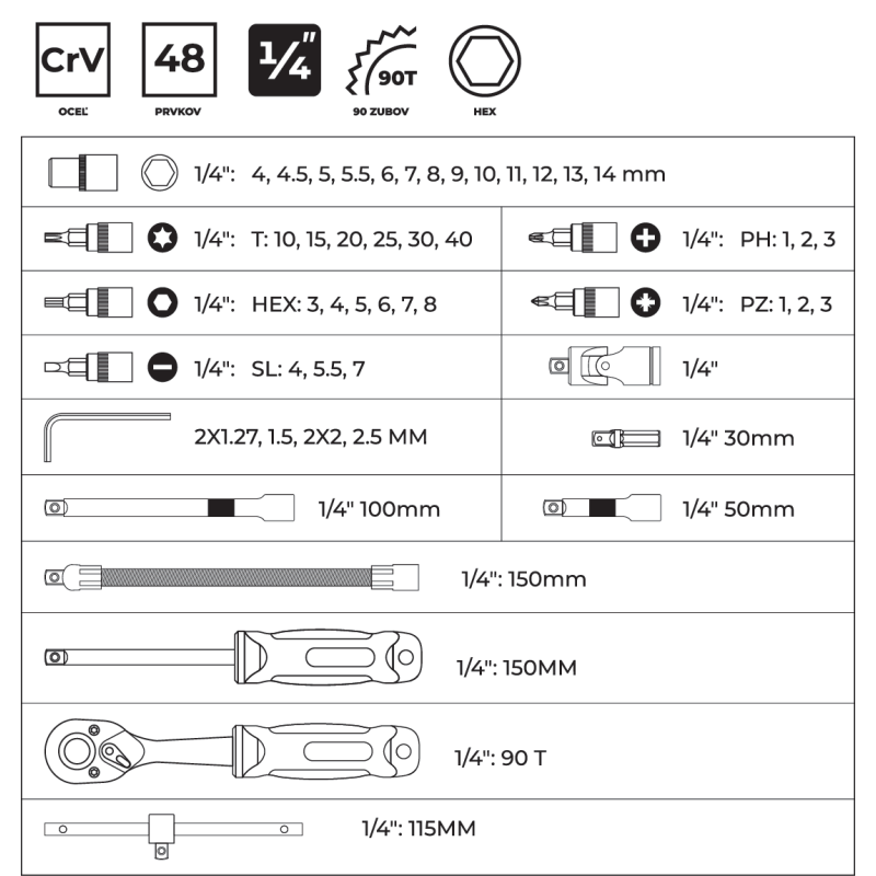 S-54020 sada nástrčných 1/4" kľúčov a bitov v plastovom obale.