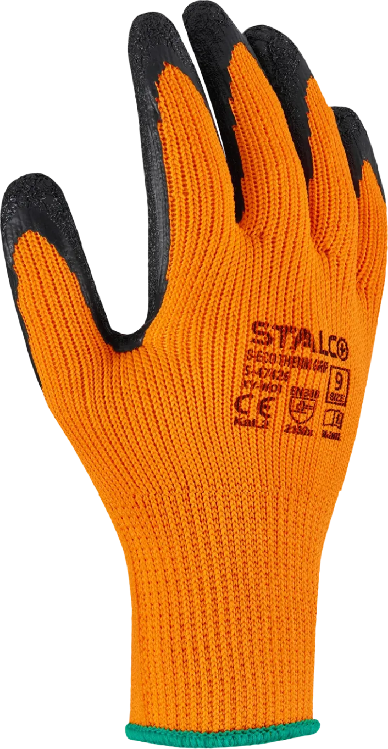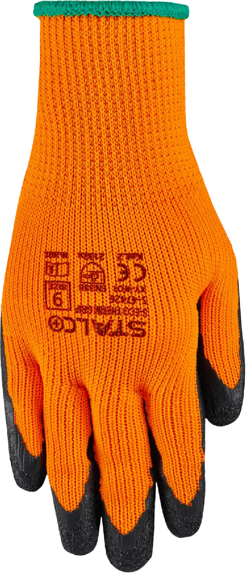 Zateplené pracovné rukavice STALCO (veľ. 11/XXL) zo zmesi polyesteru a bavlny (úplet 7G). Dlaň potiahnutá zvrásneným latexom pre pevný úchop. Vhodné do chladu a na vonkajšie práce. Kategória II, EN 388 (2132X).