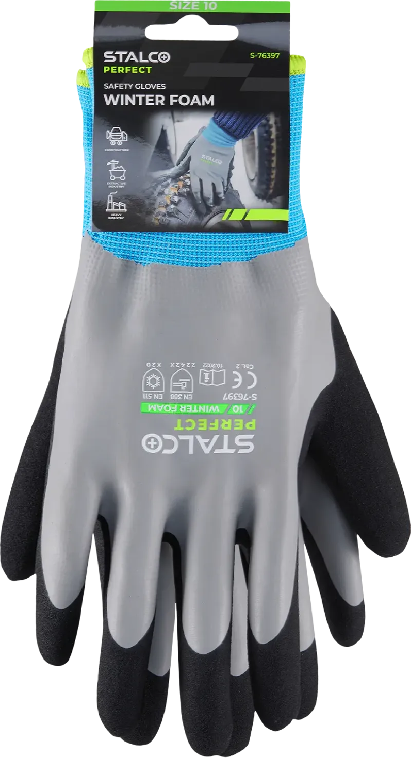 Rukavice sú vyrobené z polyesterovej tkaniny so spletom 15G. Sú zakončené manžetou a vo vnútri sa nachádza pohodlná podšívka z akrylu (7G). V rukaviciach STALCO PERFECT Winter Foam je použitá dvojitá latexová povrchová vrstva. Hladká, vodeodolná vrstva pokrýva celú dlaň. Penová vrstva so štruktúrou "Sandy Finish" sa nachádza len na vnútornej strane dlane a prstov a zaisťuje pevný úchop. Rukavice sú tiež vybavené technológiou touch screen, vďaka ktorej je možné obsluhovať smartfón bez nutnosti ich zloženia.