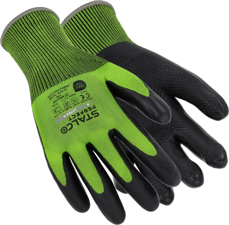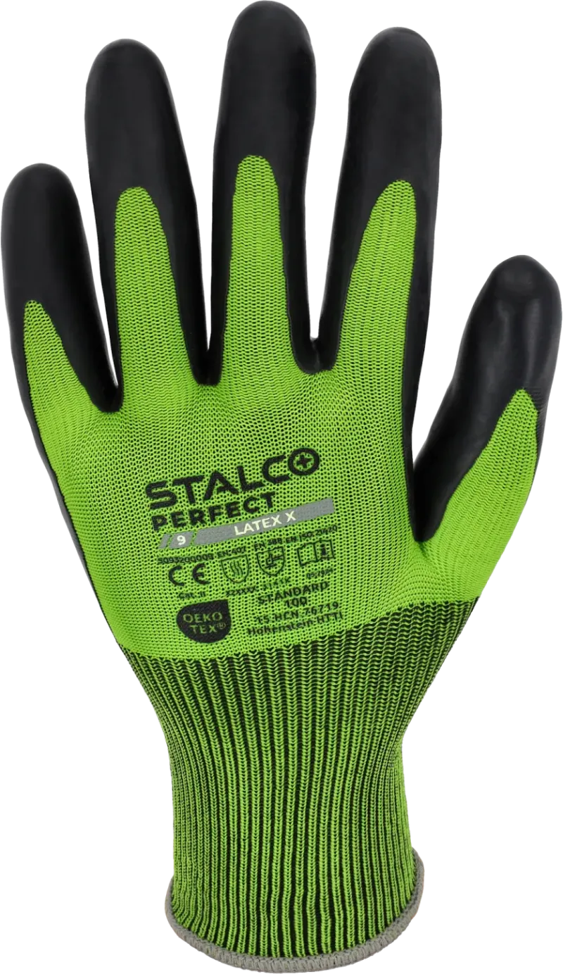 Vysoko odolné rukavice STALCO PERFECT (veľ. 10/XL) s úpletom 15G a ECO-Latex povlakom. Certifikát Oeko-Tex® Standard 100. Ochrana proti kontaktnému teplu do 250°C (EN 407: X2XXXX) a oderu (EN 388: 3141X).