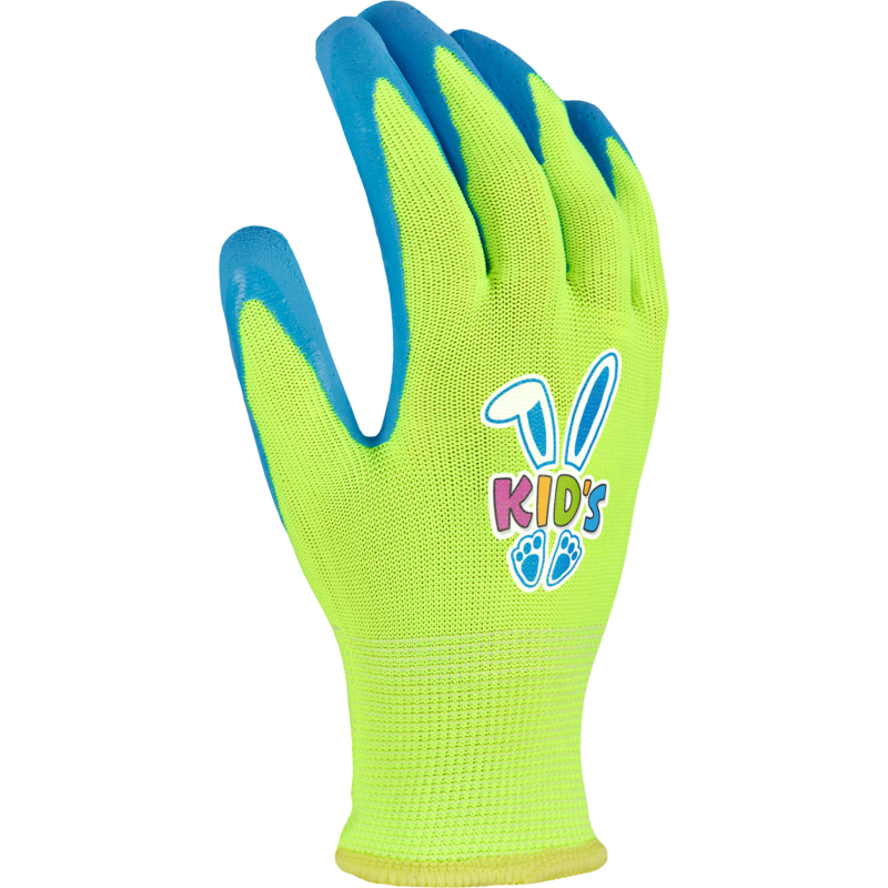 Detské polyesterové rukavice KIDS pre malých pomocníkov v záhrade a dielni. Protišmykový latexový povlak zaisťuje bezpečný úchop a fluorescenčné farby zvyšujú viditeľnosť.