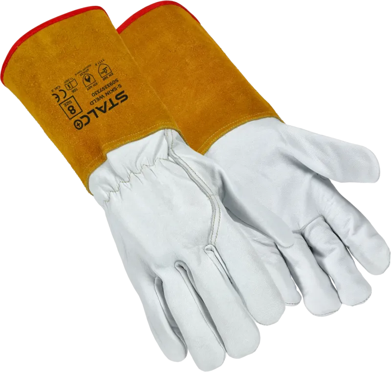 Profesionálne zváračské rukavice STALCO (veľ. 9/L), typ B. Dlaň z kozej lícovej kože, manžeta z hovädzej štiepenky. Šité niťou Kevlar®. Dĺžka 35 cm, bez podšívky pre citlivý úchop. EN 12477 Typ B.