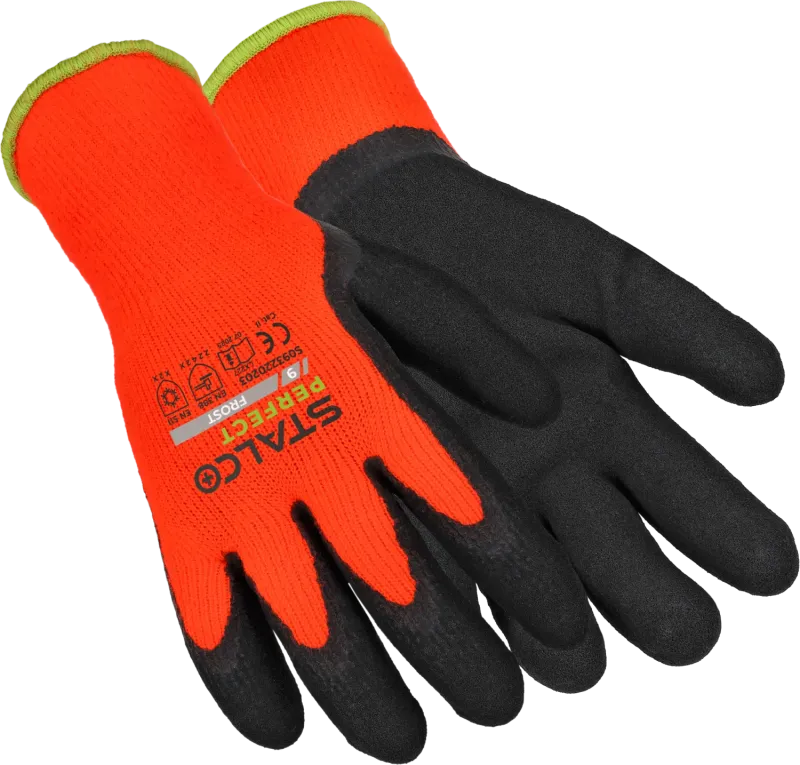 Zateplené pracovné rukavice STALCO PERFECT FROST (veľ. 10/XL) do chladného prostredia. Akrylová froté podšívka (10G), dvojitý pieskový latex s technológiou Super Grip® pre vynikajúci úchop za mokra. Ochrana proti kontaktnému chladu (EN 511: X2X).