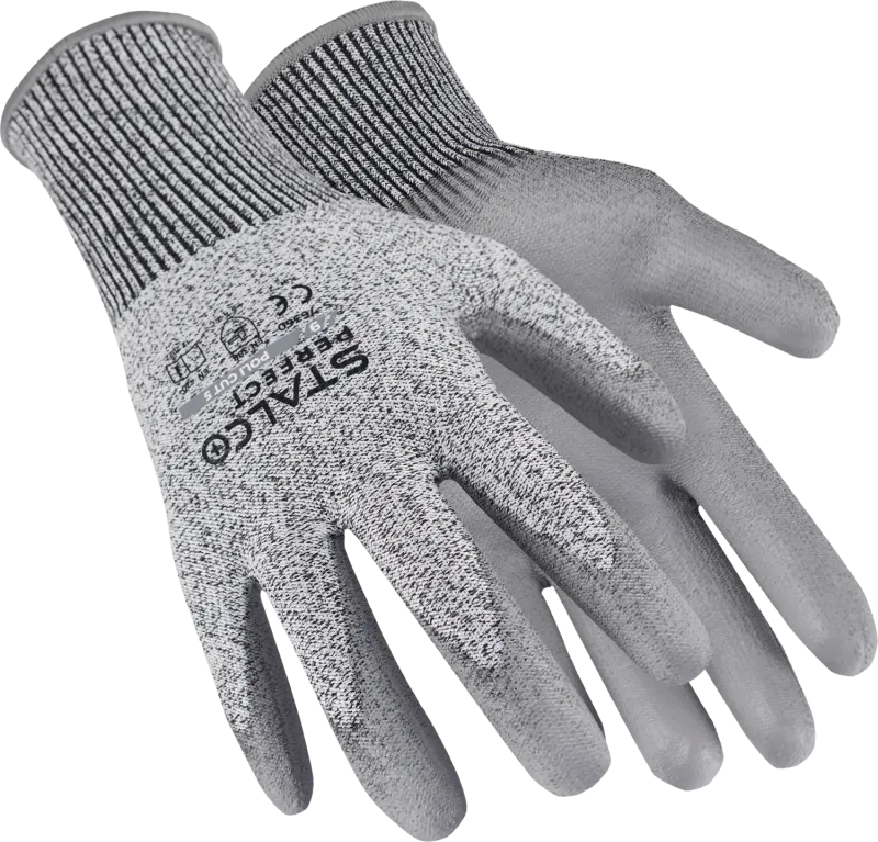 Ľahké a pohodlné rukavice STALCO (veľ. 9/L) s ochranou proti porezaniu úrovne C. Priedušný úplet 13G z HPPE a skleného vlákna, dlaň potiahnutá PU pre pevný úchop. Umožňujú ovládať dotykové obrazovky. EN 388 (4X42C).