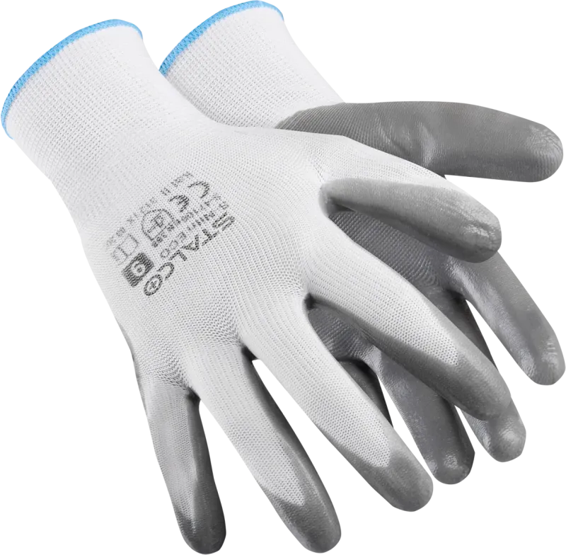 Ochranné rukavice STALCO (veľ. 6/XS) z polyesterového úpletu 13G. Dlaň potiahnutá nitrilom pre pevný úchop na suchých aj zaolejovaných povrchoch. Kategória II, EN 388 (4131X).