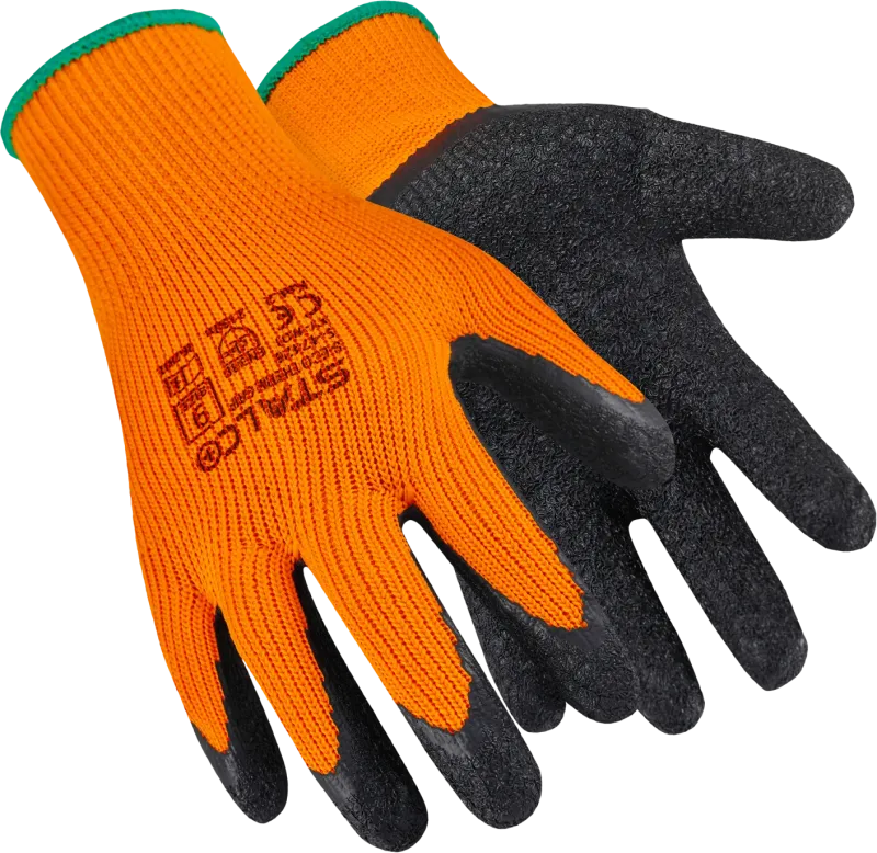 Zateplené pracovné rukavice STALCO (veľ. 9/L) zo zmesi polyesteru a bavlny (úplet 7G). Dlaň potiahnutá zvrásneným latexom pre pevný úchop. Vhodné do chladu a na vonkajšie práce. Kategória II, EN 388 (2132X).