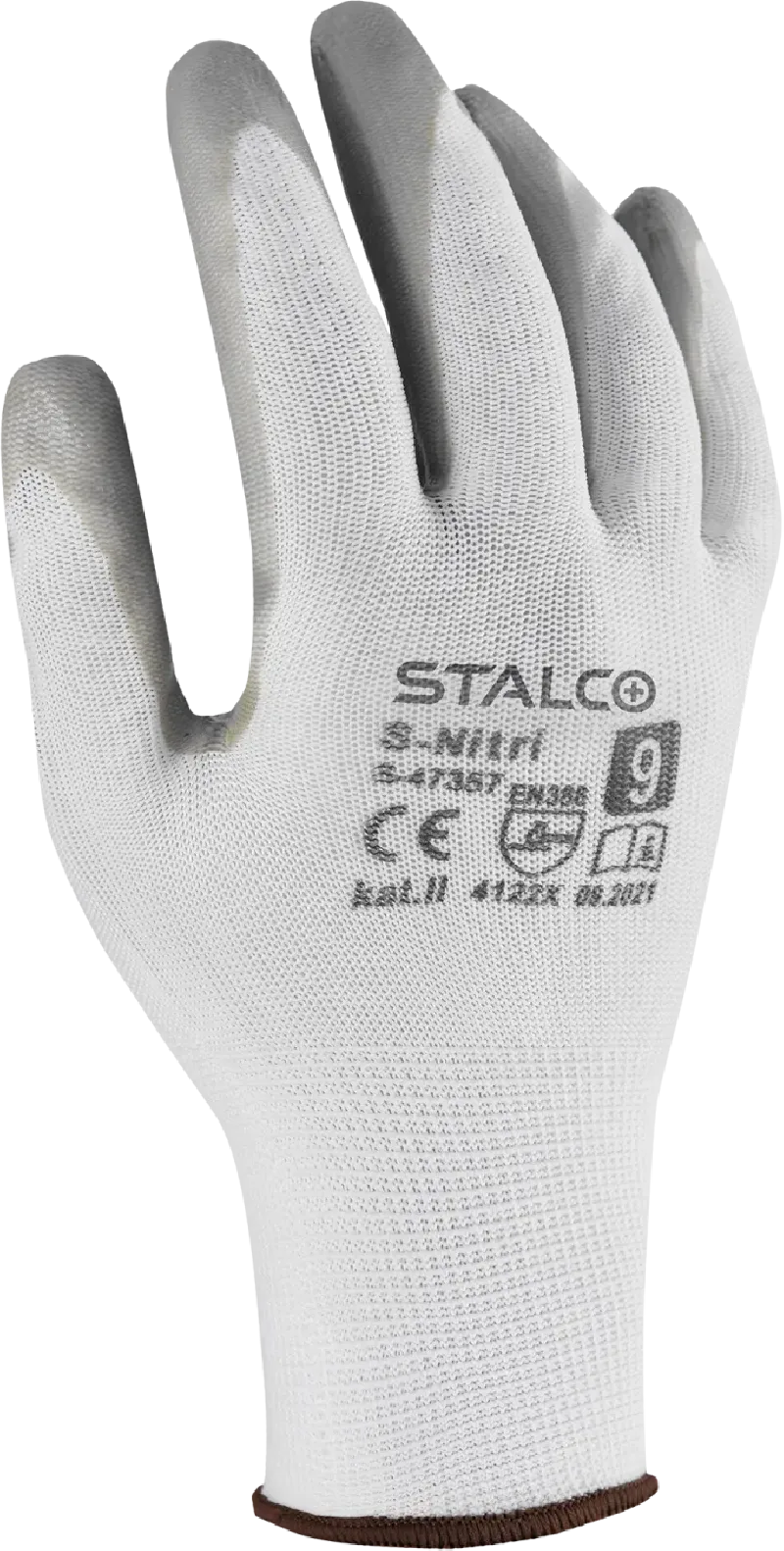 Profesionálne ochranné rukavice STALCO (veľ. 9/L) z polyesterového úpletu 13G. Dlaň potiahnutá nitrilom pre ochranu pred znečistením a pevný úchop. Kategória II, EN 388 (4131X).