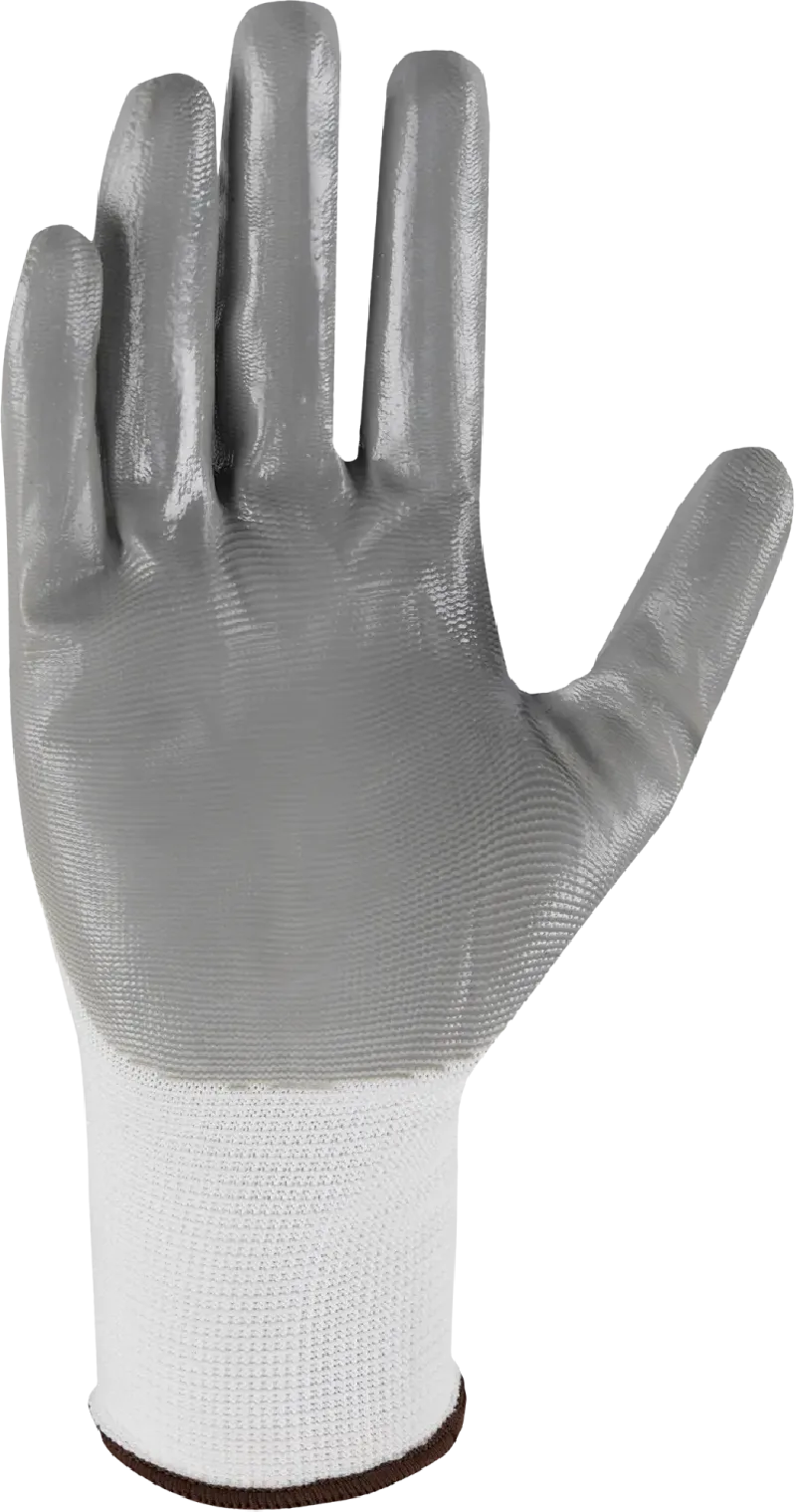 Sú vyrobené z polyesterovej tkaniny so spletom 13G, ktorá zaisťuje pružnosť a základnú ochranu. Vnútorná strana dlane je potiahnutá nitrilovou vrstvou, ktorá vytvára bariéru proti vlhkosti, olejom a nečistotám, a zároveň uľahčuje úchop klzkých prvkov. Rukavice sú v bielej farbe so sivou povrchovou úpravou.