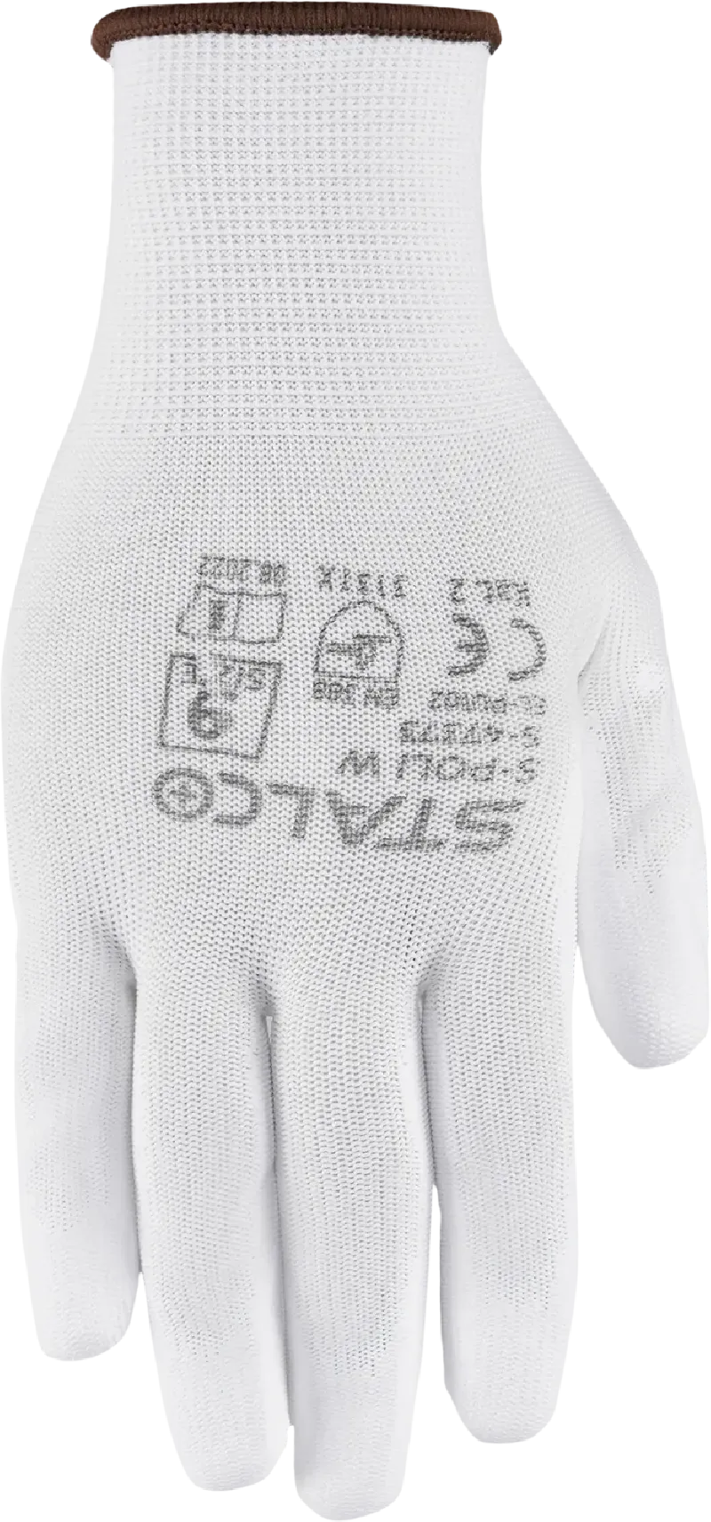 Ultraľahké pracovné rukavice STALCO (veľ. 7/S) z polyesterového úpletu 13G. Dlaň potiahnutá bielym polyuretánom (PU) pre vysokú citlivosť a ochranu. Kategória II, EN 388 (3121X).