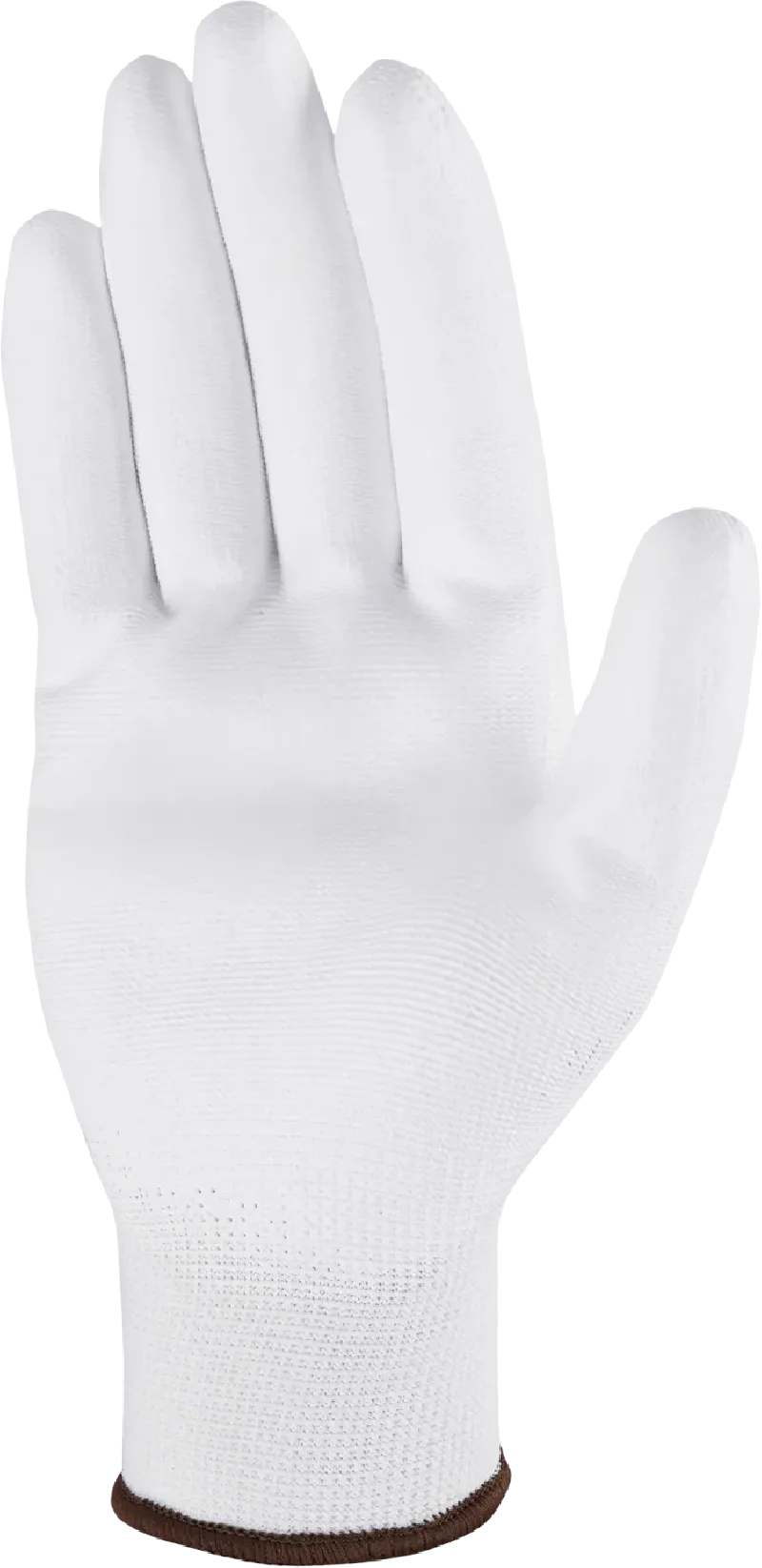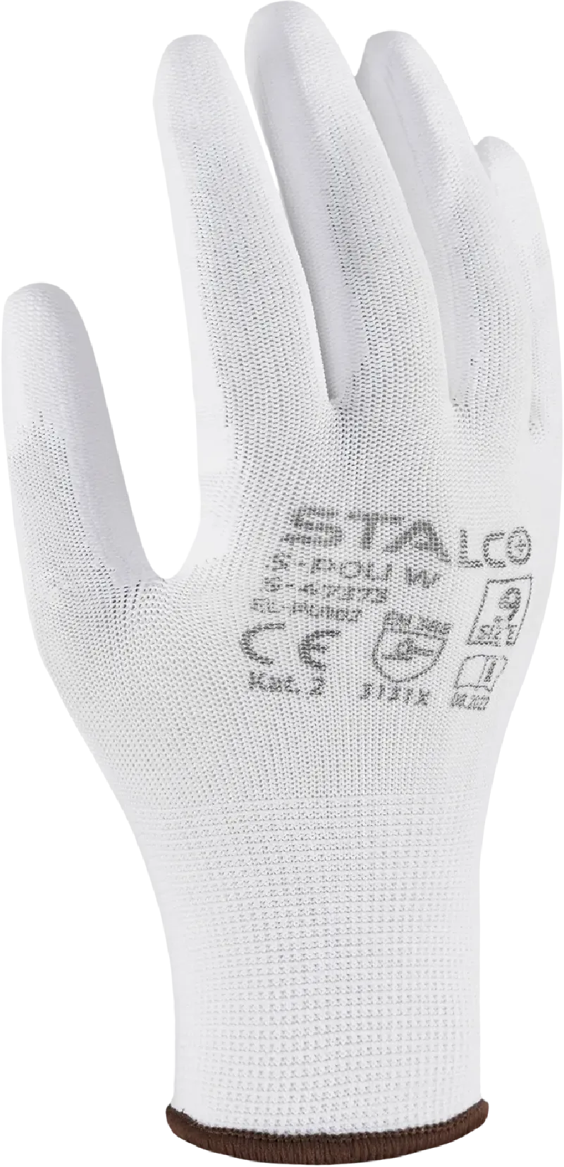 Ultraľahké pracovné rukavice STALCO (veľ. 10/XL) z polyesterového úpletu 13G. Dlaň potiahnutá bielym polyuretánom (PU) pre vysokú citlivosť a ochranu. Kategória II, EN 388 (3121X).