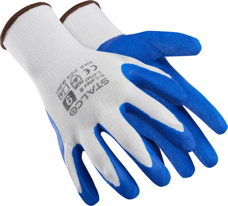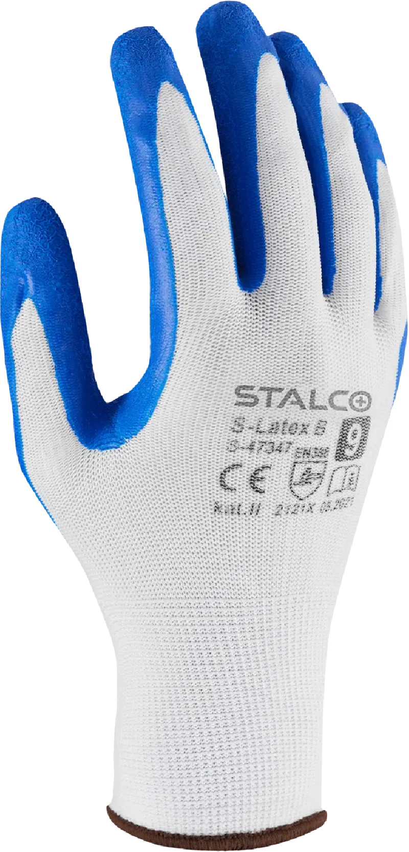 Ochranné rukavice STALCO (veľ. 8/M) z polyesterového úpletu 13G. Dlaň potiahnutá latexom pre pevný úchop a ochranu. Kategória II, EN 388 (2121X).
