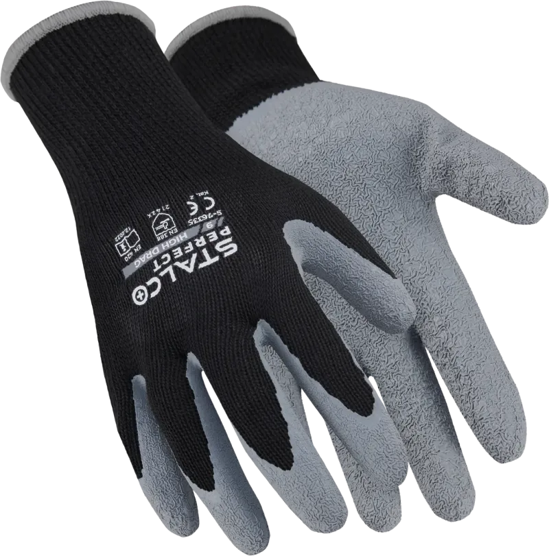 Rukavice STALCO PERFECT sú veľmi ľahké a pohodlné. Sú vyrobené z polyesterového úpletu so spletom 10G, ktorý je odolný proti roztrhnutiu a oderu. Latexový povlak aplikovaný na jednej strane zaisťuje pevný úchop a znižuje riziko poranenia. Strih rukavíc poskytuje veľkú voľnosť pri manipulácii prstami a umožňuje vykonávať aj veľmi precízne práce.