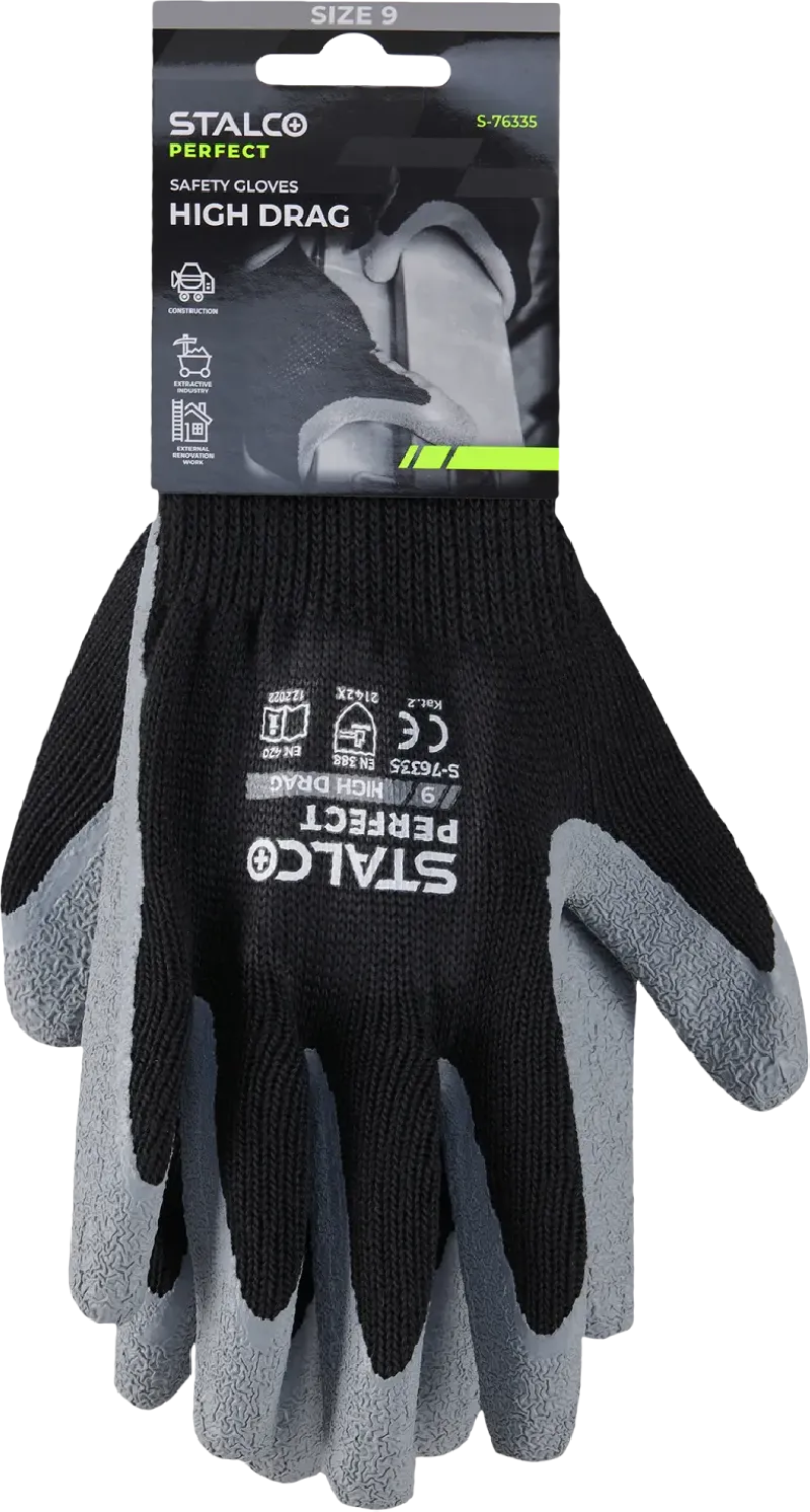 Profesionálne polyesterové rukavice HIGH DRAG od STALCO PERFECT patria medzi účinné ochranné prostriedky. Zabezpečujú ochranu pokožky rúk pred porezaním, odrením a obmedzujú riziko vzniku otlakov. Tieto ochranné prostriedky kategórie II sa osvedčili pri profesionálnych prácach v priemysle, stavebníctve a poľnohospodárstve. Ich vlastnosti zodpovedajú požiadavkám noriem EN ISO 21420 a EN 388.