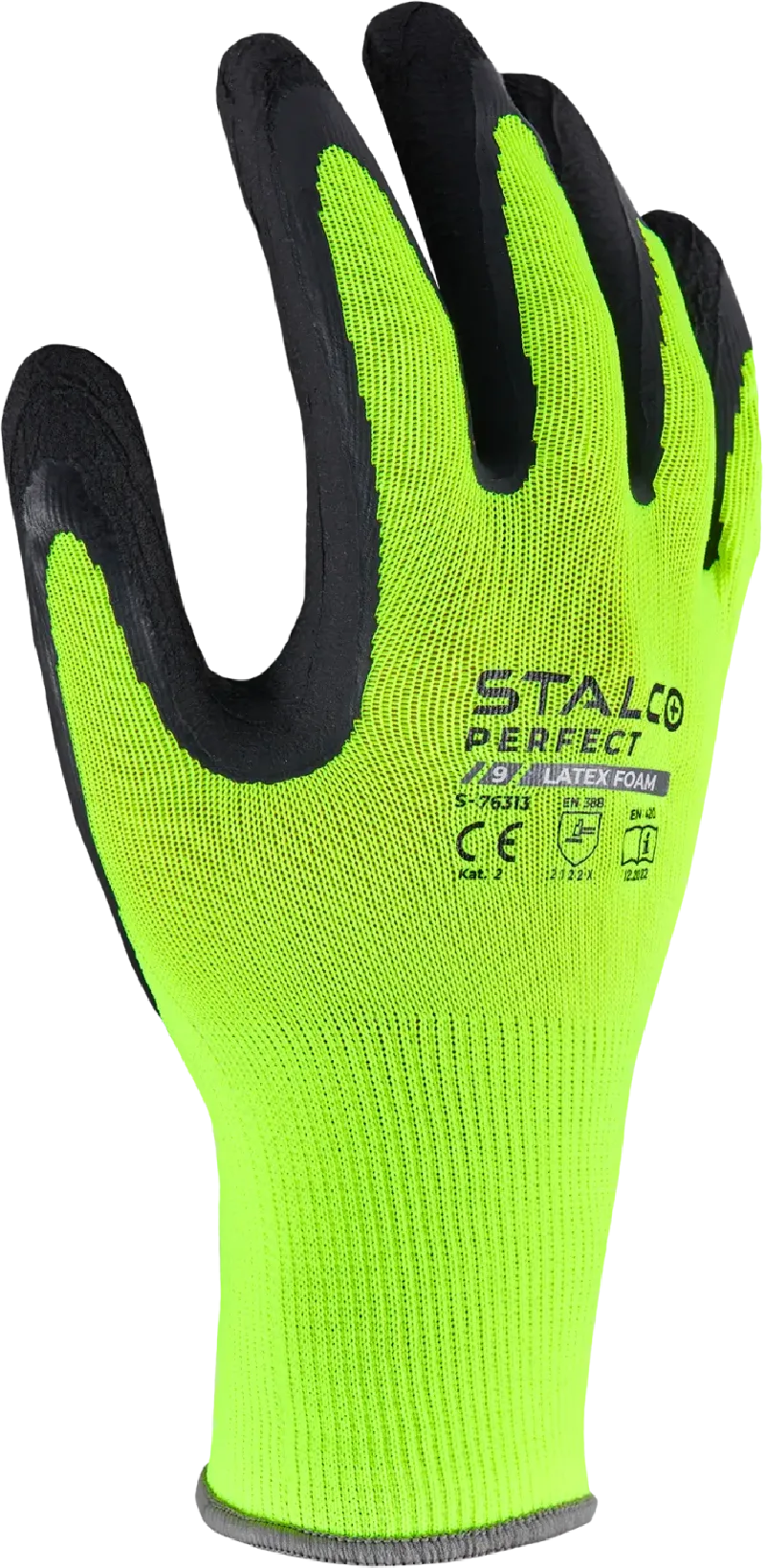 Ochranné rukavice STALCO PERFECT (veľ. 8/M) s polyesterovým úpletom 13G. Dlaň potiahnutá zvrásneným penovým latexom pre pevný úchop za sucha aj za mokra. Kategória II, EN 388 (2122X).