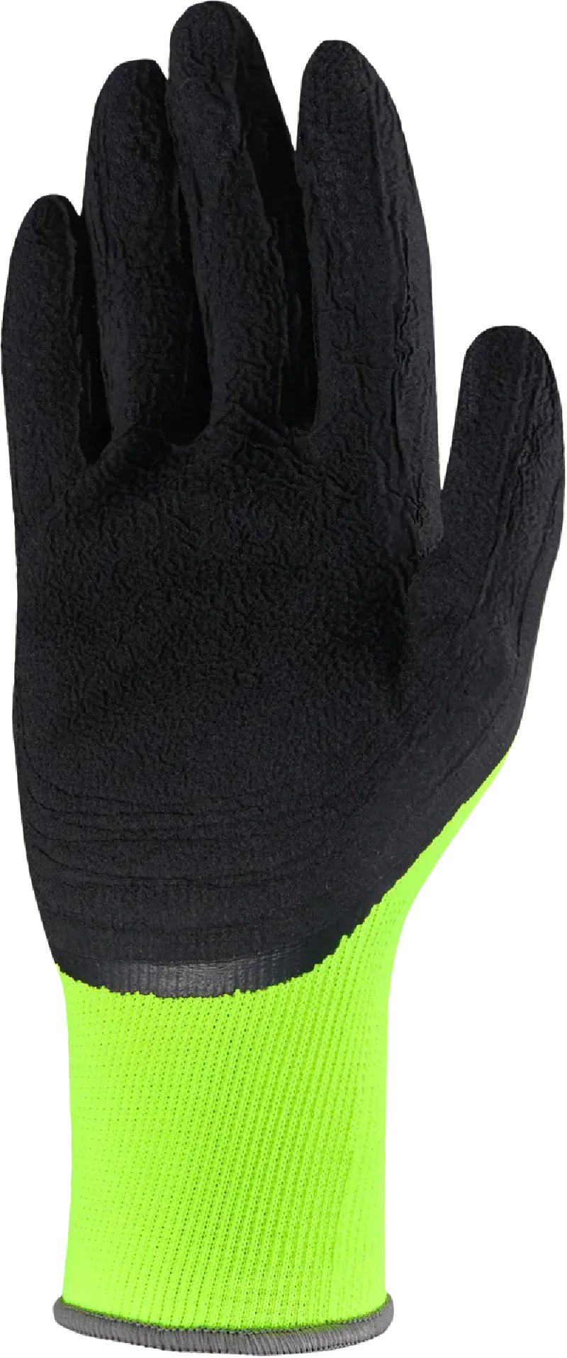 Na výrobu bol použitý polyesterový úplet s hrúbkou 13G. Tento materiál je odolný voči roztrhnutiu, je elastický a výborne sa prispôsobuje tvaru ruky. Fluorescenčná zelená farba má výstražné vlastnosti. Dlaňová časť je potiahnutá zvrásneným penovým latexom, ktorý je vodeodolný, elastický a vysoko odolný voči oderu.