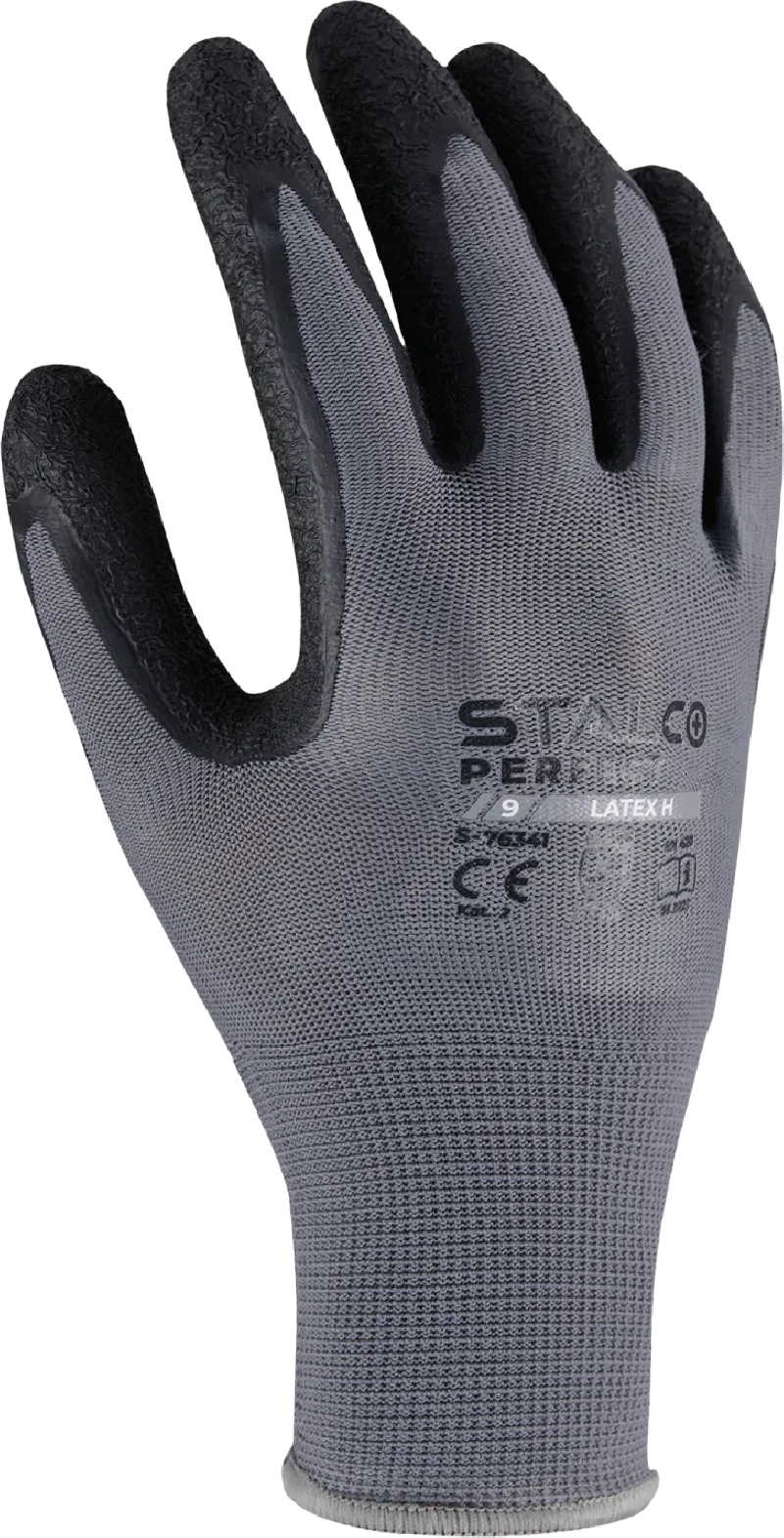 Odolné pracovné rukavice STALCO PERFECT (veľ. 6/XS) s polyesterovým úpletom 13G. Dlaň potiahnutá zvrásneným latexom pre pevný a protišmykový úchop za sucha aj za mokra. Kategória II, EN 388 (2131X).