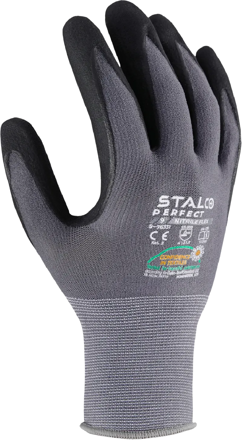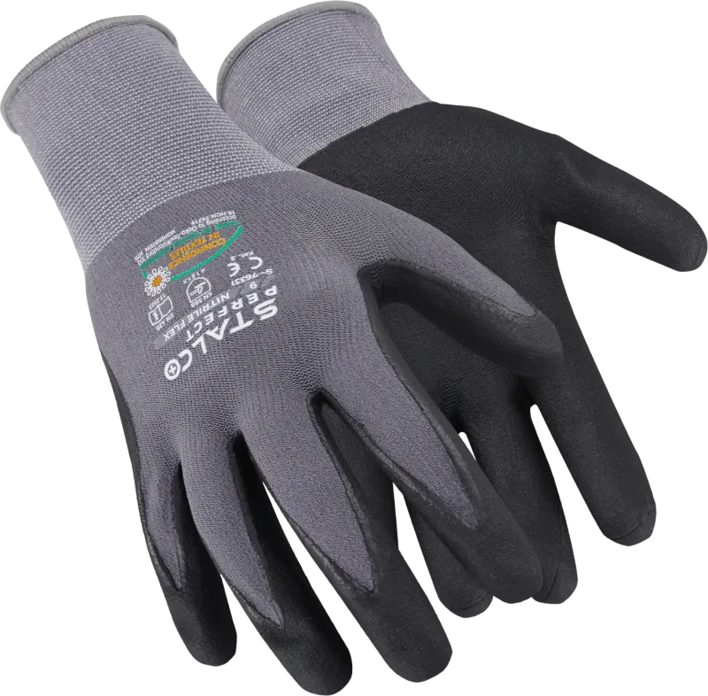 Ultraľahké rukavice STALCO PERFECT (veľ. 9/L) s priedušným úpletom 15G (nylon/elastan). Povlak z mikropenového nitrilu (Micro-Foam Nitrile) zaisťuje vynikajúcu priľnavosť za sucha aj za mokra a vysokú citlivosť. EN 388 (4131X).