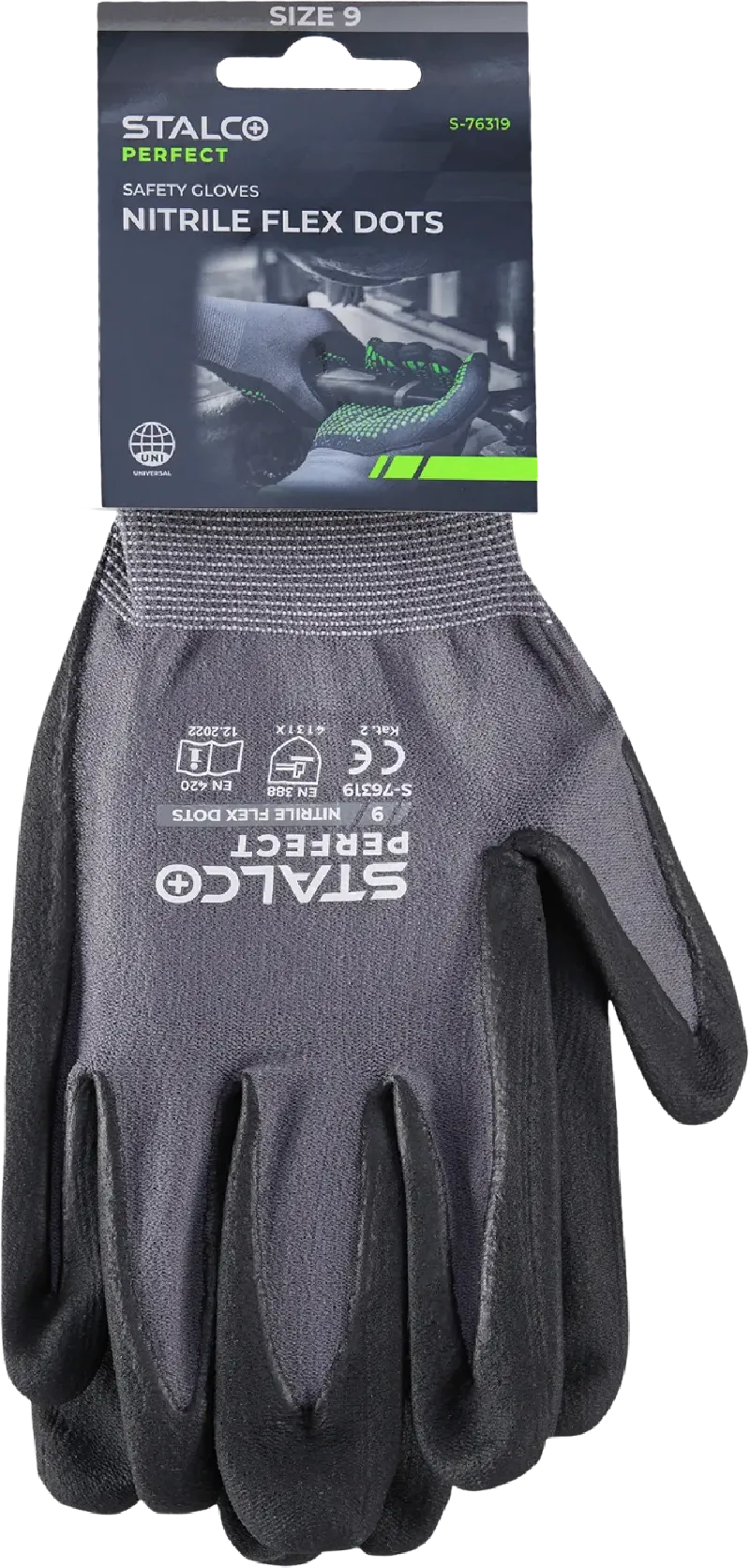 Nylónové rukavice NITRILE FLEX DOTS od STALCO PERFECT sú ultraľahké a pohodlné ochranné rukavice, ktoré poskytujú mechanickú ochranu rúk a vysokú presnosť pohybu. Sú vyrobené z nylónového úpletu s hrúbkou 15G, ktorý je doplnený elastanom, vďaka čomu sa dokonale prispôsobia tvaru ruky a neobmedzujú pohyb. Spĺňajú požiadavky noriem EN ISO 21420 a EN 388.