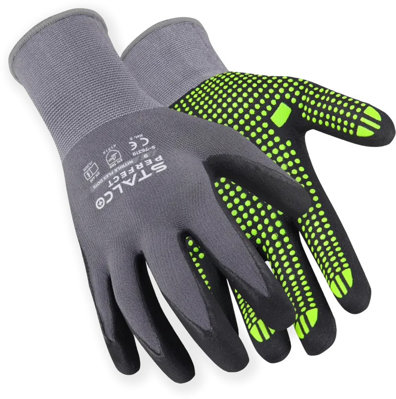 Nylónové rukavice NITRILE FLEX DOTS od STALCO PERFECT sú ultraľahké a pohodlné ochranné rukavice, ktoré poskytujú mechanickú ochranu rúk a vysokú presnosť pohybu. Sú vyrobené z nylónového úpletu s hrúbkou 15G, ktorý je doplnený elastanom, vďaka čomu sa dokonale prispôsobia tvaru ruky a neobmedzujú pohyb. Spĺňajú požiadavky noriem EN ISO 21420 a EN 388.