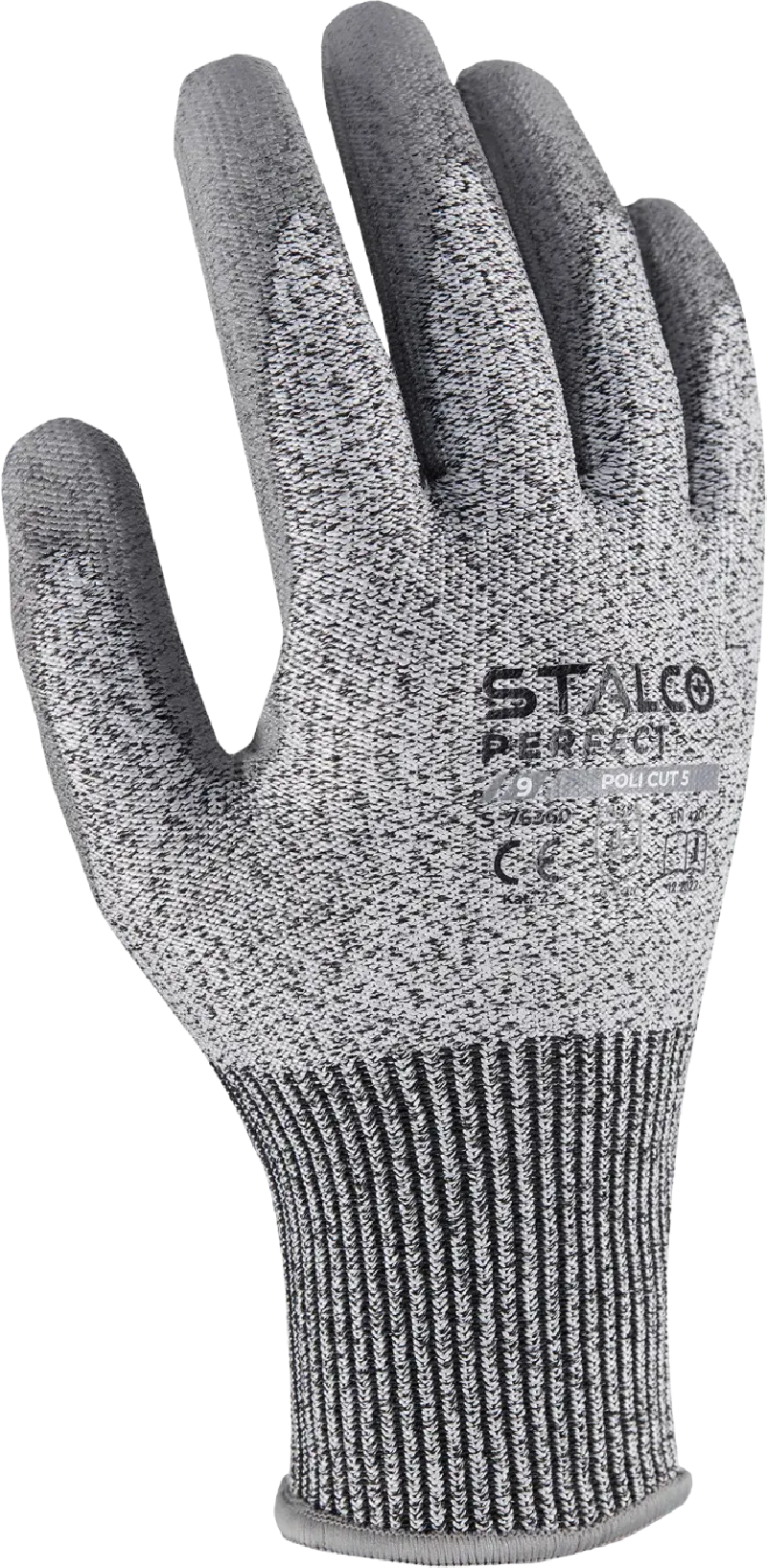 Polyuretánové rukavice POLI CUT 5 od STALCO PERFECT sú špecializované ochranné prostriedky určené pre práce s vysokým rizikom porezania. Ich charakteristickou črtou je extrémne vysoká odolnosť proti porezaniu (stupeň E / C), čo potvrdzuje splnenie noriem EN ISO 21420 a EN 388 (4542C). Rukavice chránia ruky pred porezaním, odrením, kontaktom s ostrými prvkami a znečistením.