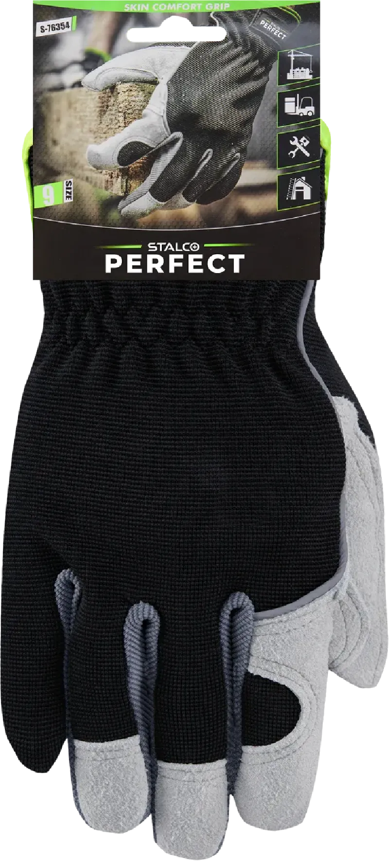 Profesionálne kožené rukavice SKIN COMFORT GRIP od STALCO PERFECT sú produktom obľúbeným v priemysle. Poskytujú spoľahlivú ochranu rúk pred porezaním, otlakmi a znečistením. Spĺňajú normy EN 420 a EN 388 (3132X) a sú klasifikované ako OOP kategórie II. Sú ideálne pre práce v doprave a logistike, pri ľahkých montážnych, stavebných a mechanických prácach.