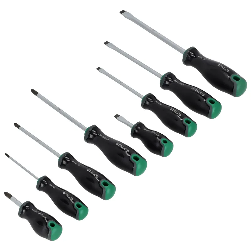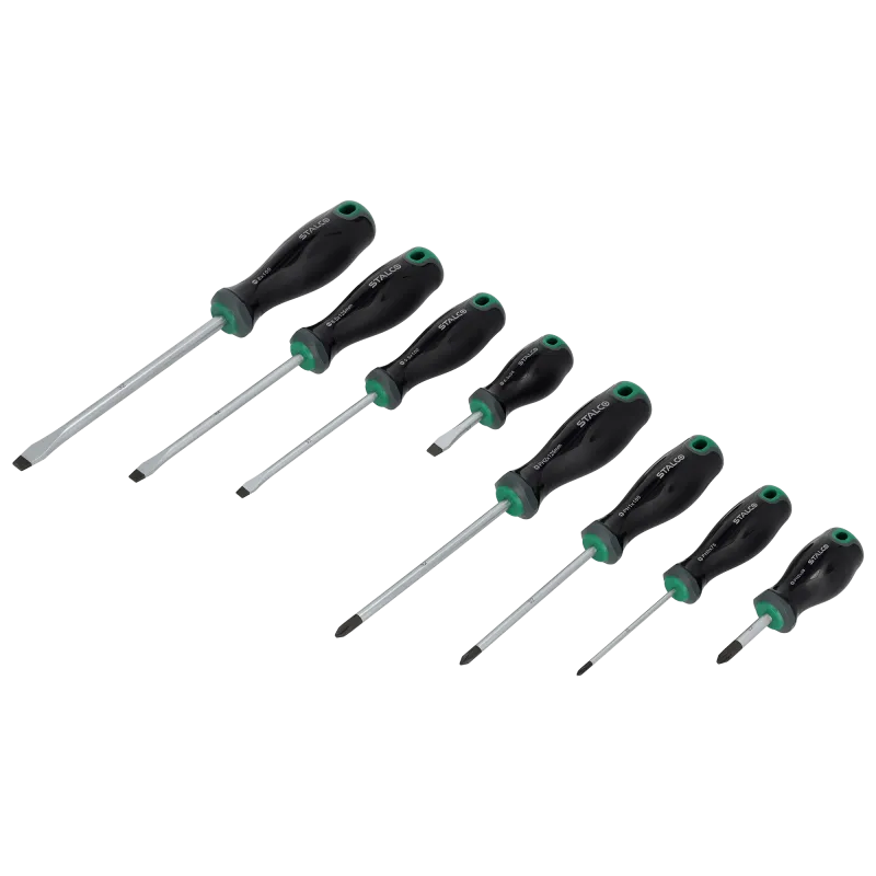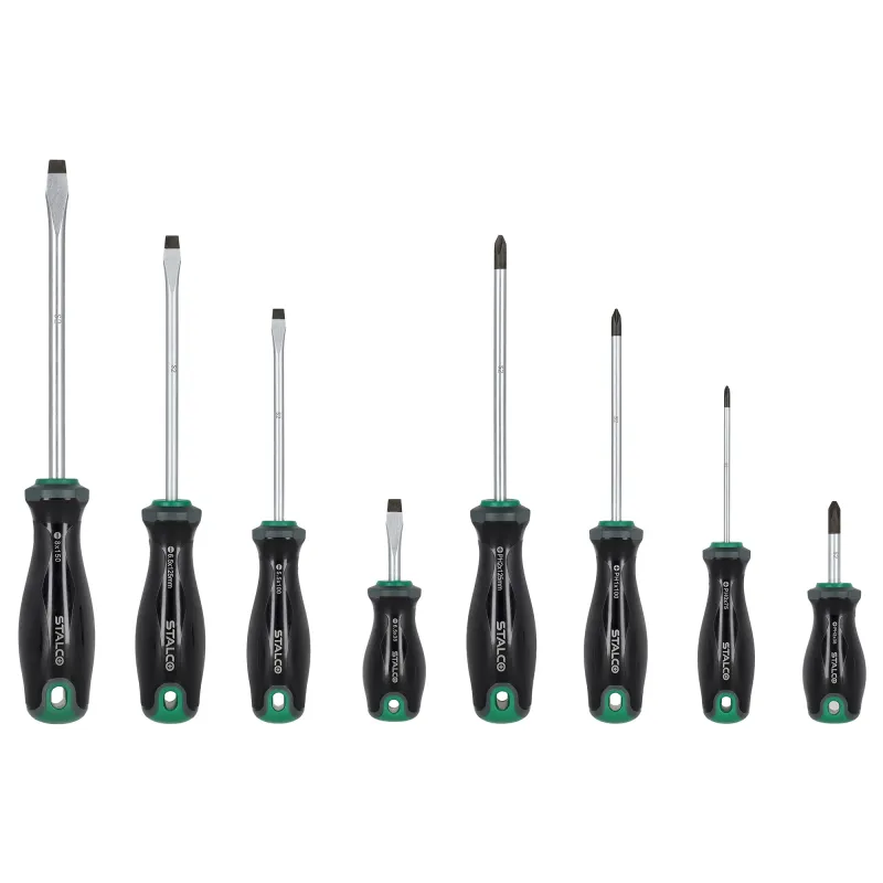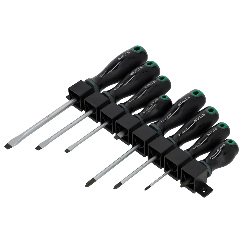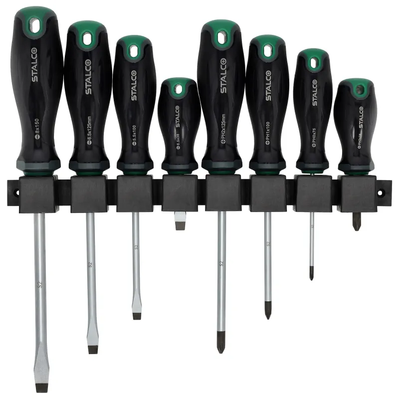 Kompletná 8-dielna sada skrutkovačov STALCO navrhnutá pre rôznorodé úlohy. Nájde uplatnenie v mechanike, zámočníctve a ďalších dielenských prácach. Sada je vybavená šikovným držiakom, ktorý je možné priskrutkovať na panel s náradím. Každý zo skrutkovačov má zmagnetizovaný hrot, čo dodatočne zvyšuje komfort práce.