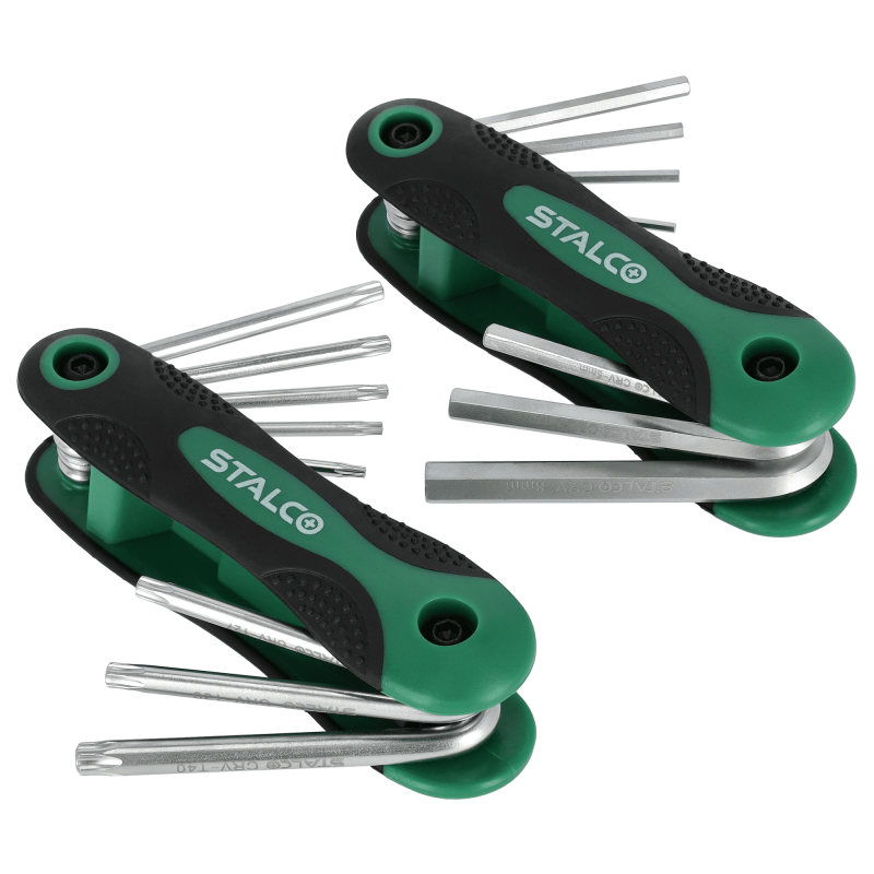 Sada šesťhranných kľúčov je užitočným príslušenstvom na ručné práce. Skladá sa z plastového tela a kľúčov TORX a HEX, ktoré sa z neho vysúvajú. Každý z kľúčov má inú veľkosť a hodí sa na štandardné skrutky používané v stavebných konštrukciách, spotrebnej elektronike a krytoch bielej techniky, ako aj v niektorých strojoch. Sada šesťhranných kľúčov STALCO sa osvedčuje najmä ako doplnkový nástroj používaný v núdzových situáciách. Vďaka tejto konštrukcii má obsluha k dispozícii 8 univerzálnych kľúčov. Použitie CrV ocele na tavenie zaručuje dlhú životnosť kľúčov. Hroty sa opotrebúvajú pomaly, takže zostávajú dlho zladené s otvormi v príslušenstve spojovacieho materiálu.
