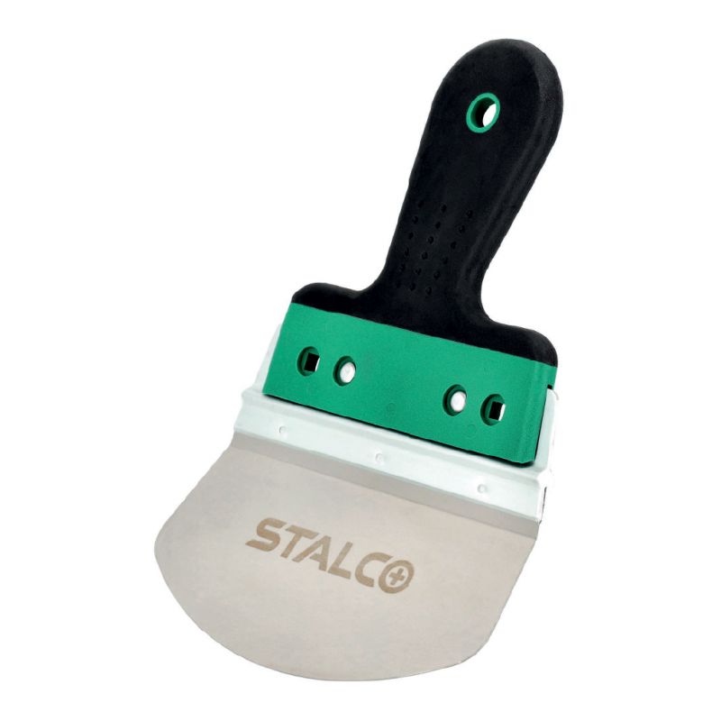 Špachtľa na vedro „Bucket Scoop“ vyrobená z nehrdzavejúcej ocele s hrúbkou 0,7 mm a s tvarovaným povrchom na zvýšenie rýchlosti a produktivity pri naberaní všetkých druhov sadrových zmesí, omietok, malty, lepidiel a iných hustých stavebných materiálov balených alebo vyrobených v guľatých nádobách, vedrách a zásobníkoch atď. Ľahká dvojzložková rukoväť SOFT poskytuje bezpečné uchopenie a pohodlné používanie. Vyrezaný otvor v nej umožňuje zavesenie špachtle na stenu v dielni alebo na policu.