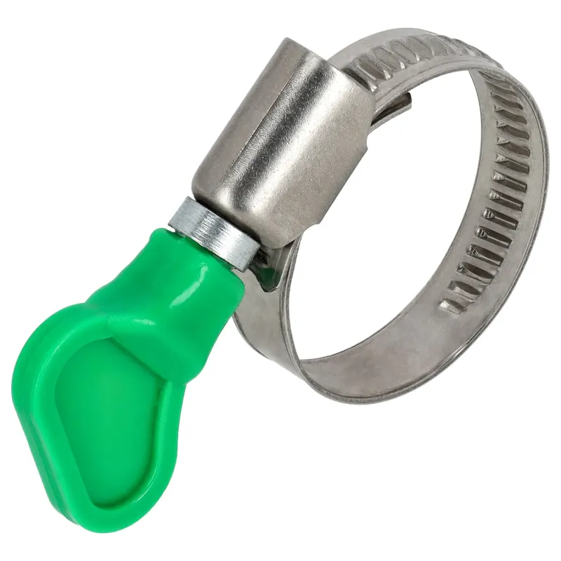 Nehrdzavejúca závitovková hadicová spona s plastovým motýlikom pre rýchlu ručnú montáž bez náradia. Páska z nehrdzavejúcej ocele (9 mm) so zaoblenými hranami chráni hadicu pred poškodením.
