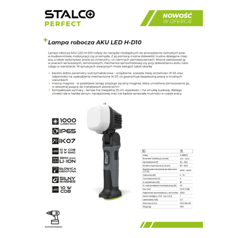 Pracovná lampa AKU LED H-OSL10 je užitočným zariadením pre dielenské a servisné práce. Umožňuje presné nasmerovanie svetelného lúča na ľubovoľné zvolené miesto. Vďaka svojmu štíhlemu dizajnu sa dá použiť pri práci na ťažko prístupných miestach, v automechanike, pri údržbe priemyselných strojov alebo pri opravách elektrických zariadení. Pracovné LED svietidlo AKU od spoločnosti STALCO má malé rozmery a veľmi praktický dizajn. Hlavu svetla možno nastaviť v rozsahu 120 stupňov, takže svetelný lúč bude nasmerovaný presne na požadované miesto. Zariadenie má vysokú triedu mechanickej odolnosti IK 07 a stupeň krytia IP 65, takže pracovné LED svietidlo AKU H-OSL10 možno používať aj vo vonkajšom prostredí a na prácu vo vlhkých priestoroch. Vďaka kapacitnej nabíjateľnej batérii je prevádzkový čas na plnú batériu až 10 hodín.