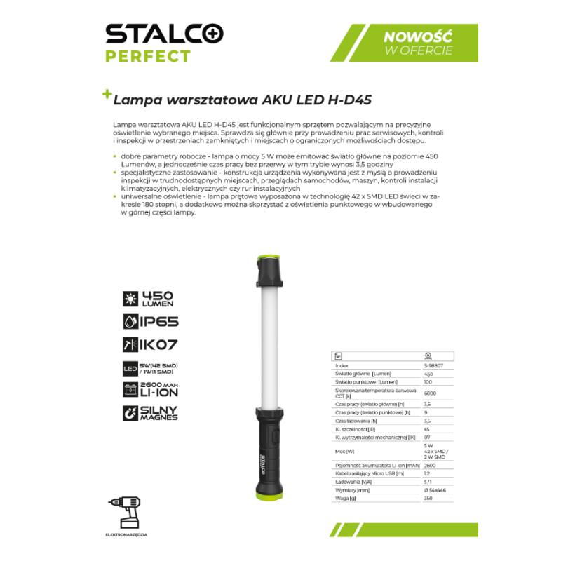 Kontrolná ručná dielenská lampa AKU LED H-D45 je funkčné zariadenie, ktoré umožňuje presné osvetlenie vybraného priestoru. Je vhodná najmä na servisné práce, kontrolu a inšpekciu v stiesnených priestoroch a na miestach s obmedzeným prístupom. Napája sa pomocou 2600 mAh batérie, takže nie je potrebné dávať pozor na jej pripojenie do elektrickej siete. Samotná batéria sa pomocou dodanej nabíjačky nabíja maximálne 3,5 hodiny. Dielenská LED lampa STALCO AKU má predĺžený trubicový tvar s prídavným zdrojom svetla v prednej časti. Pohodlná rukoväť a nízka hmotnosť uľahčujú presun zariadenia na požadované miesto. V prípade potreby možno lampu pripevniť ku kovovej konštrukcii pomocou silného zabudovaného magnetu v rukoväti. Dielenská lampa AKU LED má vysokú triedu tesnosti a mechanickej pevnosti, a preto je odolná voči otrasom, nárazom alebo vlhkosti.