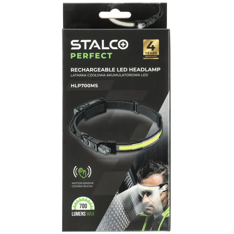 Profesionálna LED čelovka STALCO PERFECT HLP700MS s výkonom 700 lm a dosvitom 50 m. Ponúka 5 režimov svietenia, senzor pohybu, regulované bodové svetlo (SMD) a širokouhlé svetlo (COB). Odolnosť IP54, nabíjanie cez USB-C.