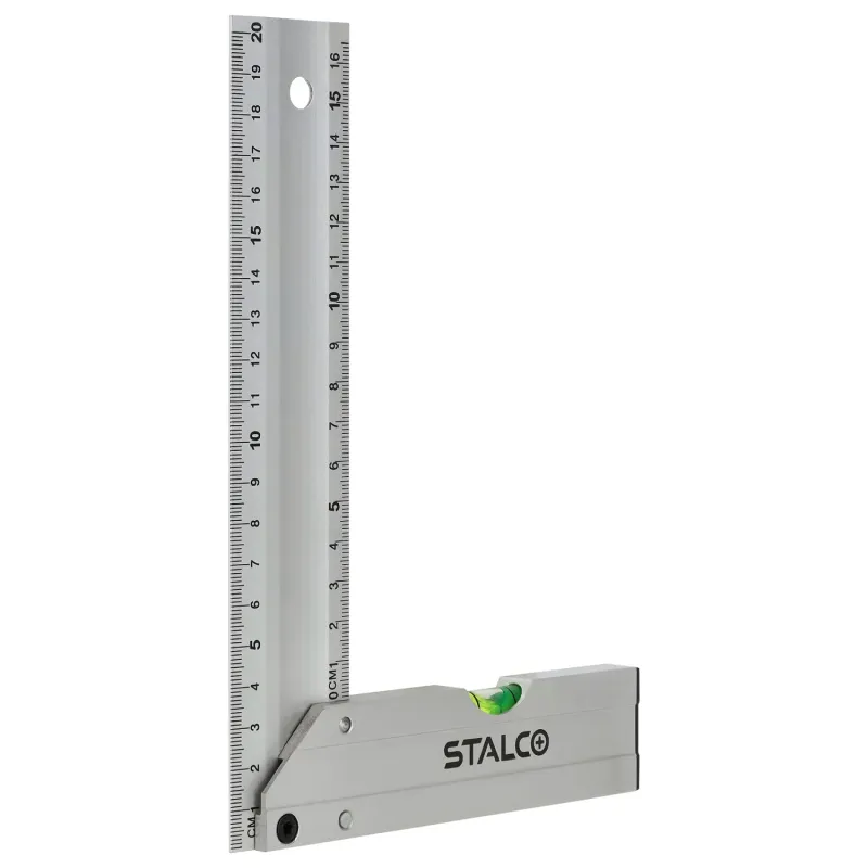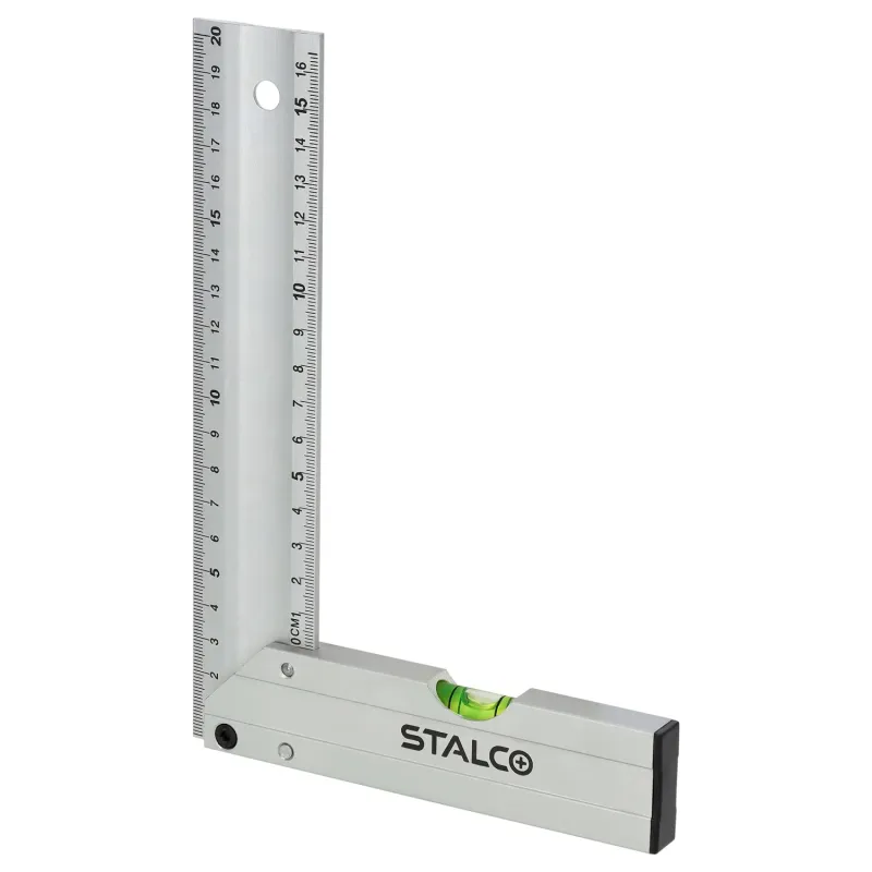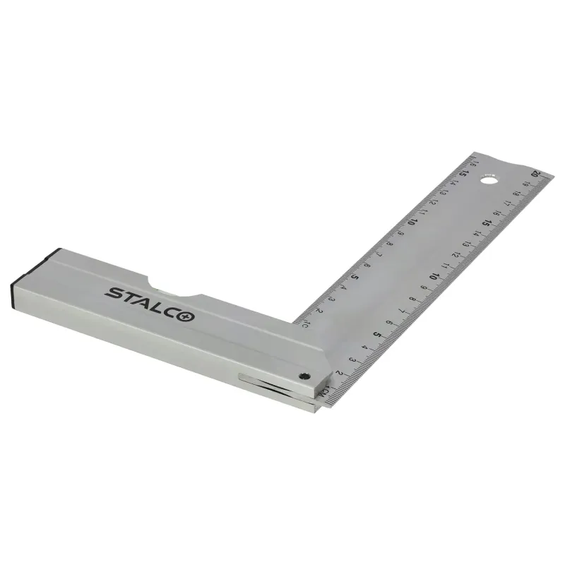 Pevná konštrukcia zaisťuje presné vytyčovanie pravého uhla a čitateľná stupnica uľahčuje rýchle rysovanie. V základni namontovaná libela umožňuje kontrolu odchýlky od roviny, čo zvyšuje funkčnosť náradia pri montážnych prácach. Kompaktný rozmer sa osvedčí v dielni aj na stavbe.