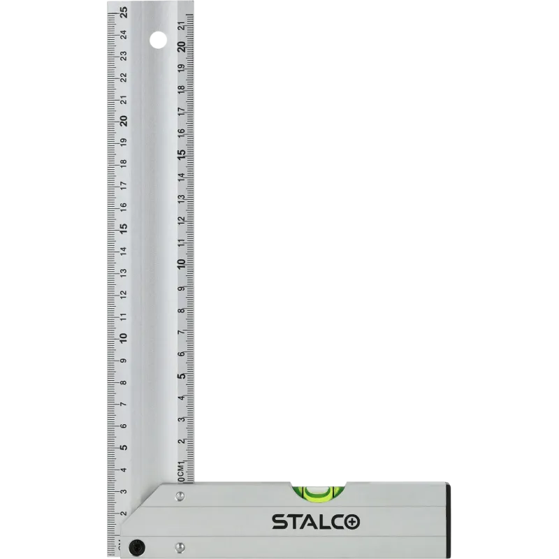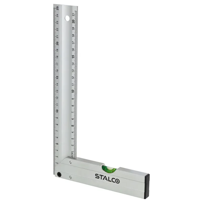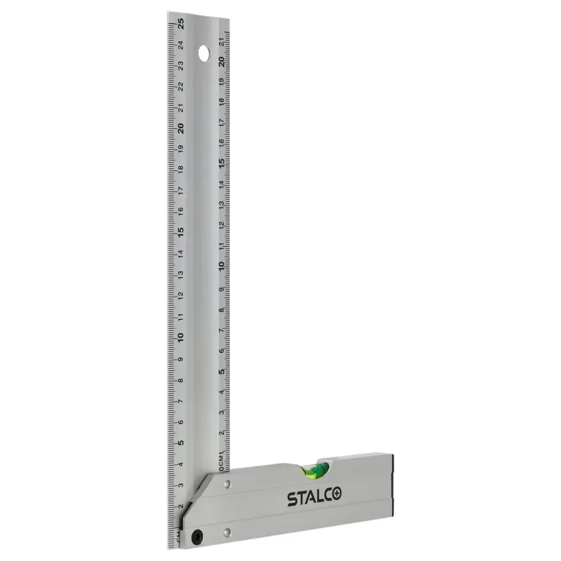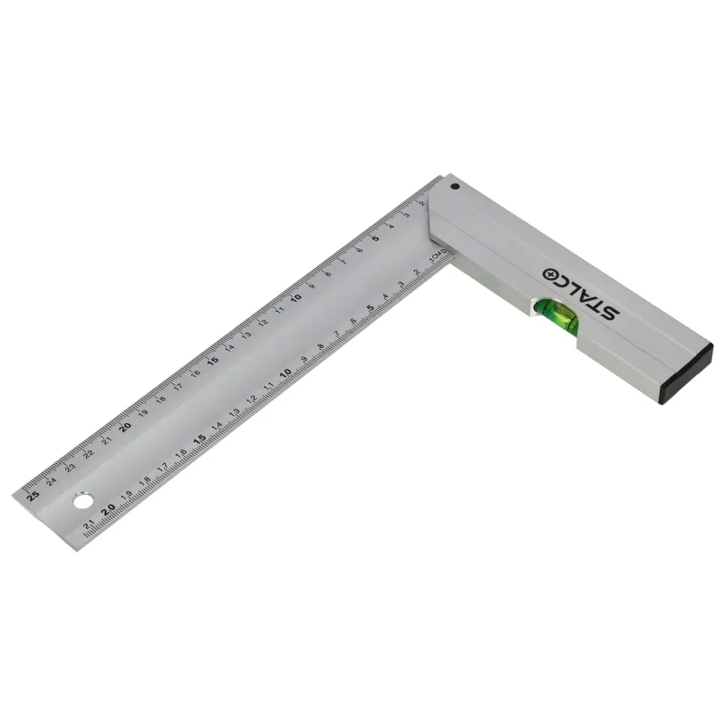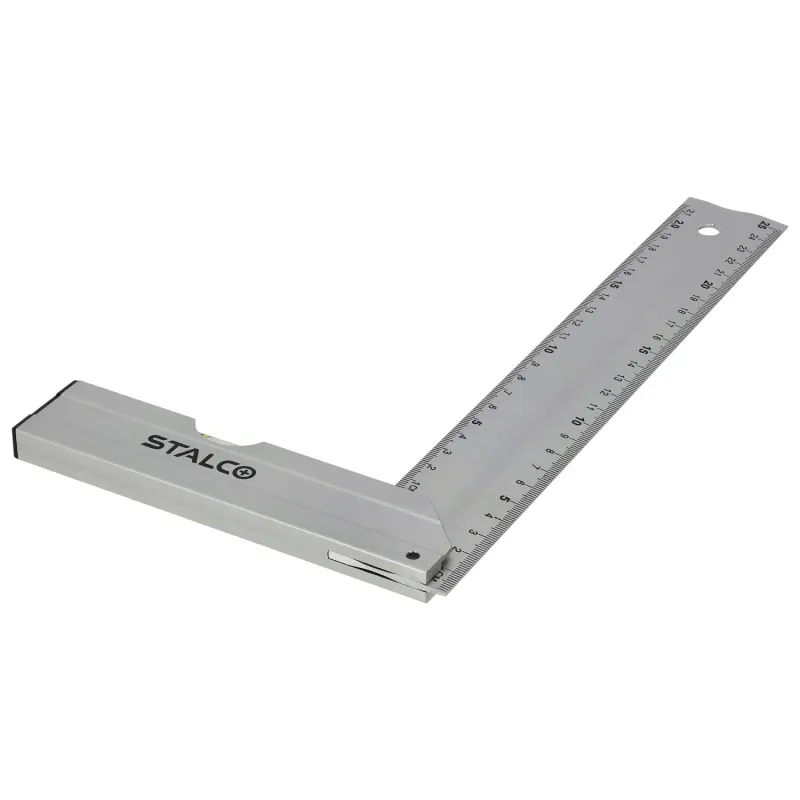 Pevná konštrukcia zaisťuje presné vytyčovanie pravého uhla a čitateľná stupnica uľahčuje rýchle rysovanie. V základni namontovaná libela umožňuje kontrolu odchýlky od roviny, čo zvyšuje funkčnosť náradia pri montážnych prácach. Kompaktný rozmer sa osvedčí v dielni aj na stavbe.